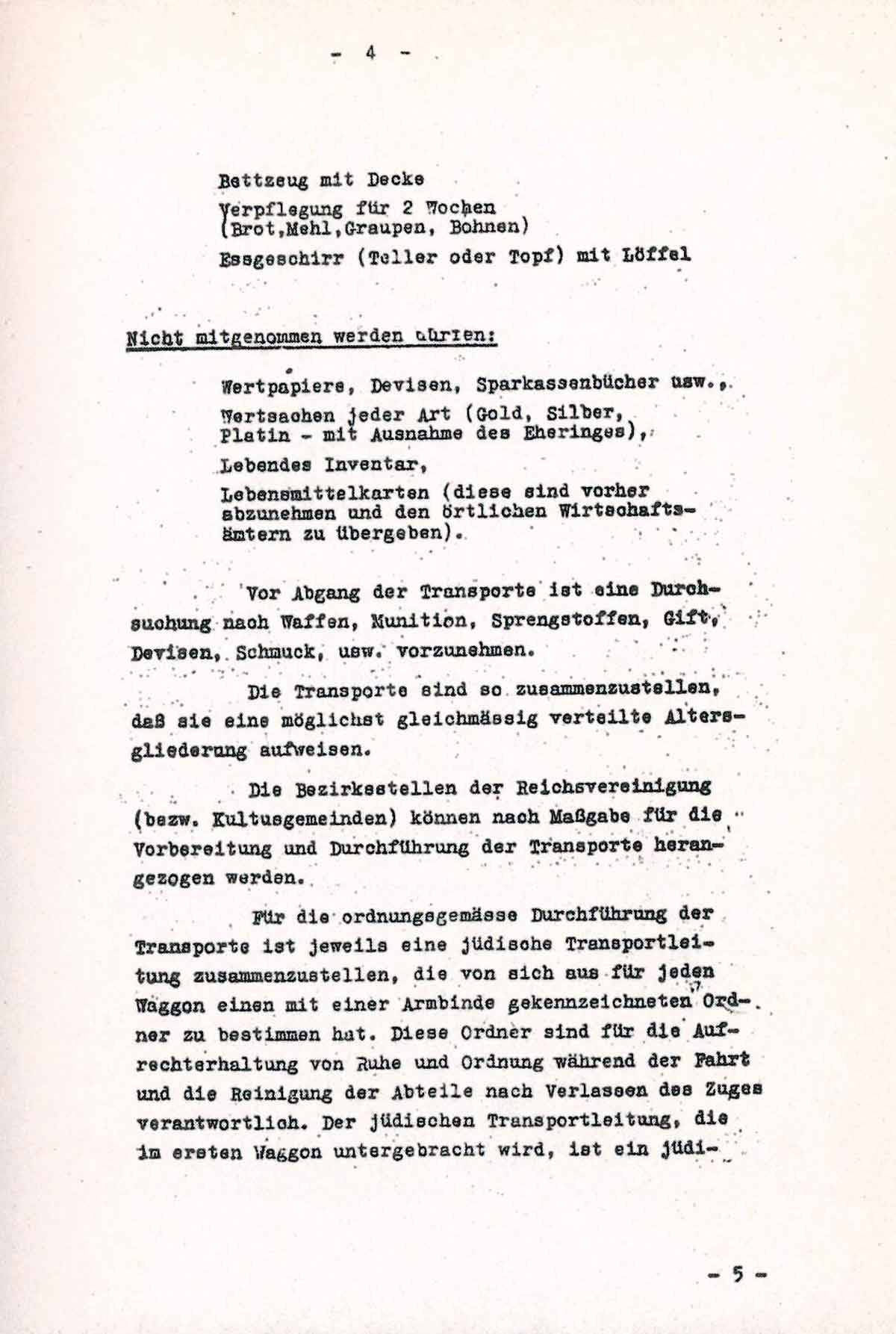 Für die ordnungsgemässe Durchführung der Transports ist jeweils eine jüdische Transportleitung zusammenzustellen, die von sich aus für jeden Waggon einen mit einer Armbinde gekennzeichneten Ordner zu bestimmen hat. Diese Ordner sind für die Aufrechterhaltung von Ruhe und Ordnung während der Fahrt und die Reinigung der Abteile nach Verlassen des Zuges verantwortlich. Der jüdischen Transportleitung, die im ersten Waggon untergebracht wird, ist ein Jüdischer Arzt bezw. Sanitäter mit Sanitätsmaterial zuzuteilen.