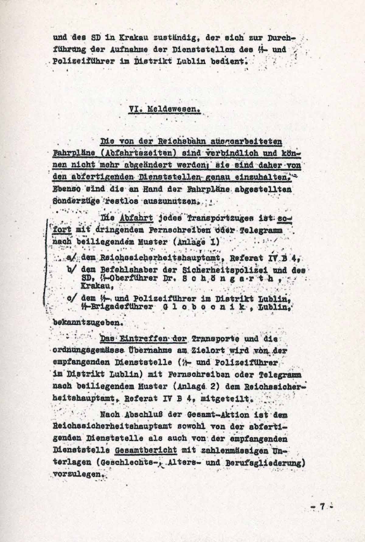 Das Eintreffen der Transporte und die ordnungsgemässe Übernahme am Zielort wird von der empfangenden Dienststelle (SS- und Polizeiführer im Distrikt Lublin) mit Fernschreiben oder Telegramm nach beiliegendem Muster (Anlage 2) dem Reichssicherheitshauptamt, Referat IV B 4, mitgeteilt.