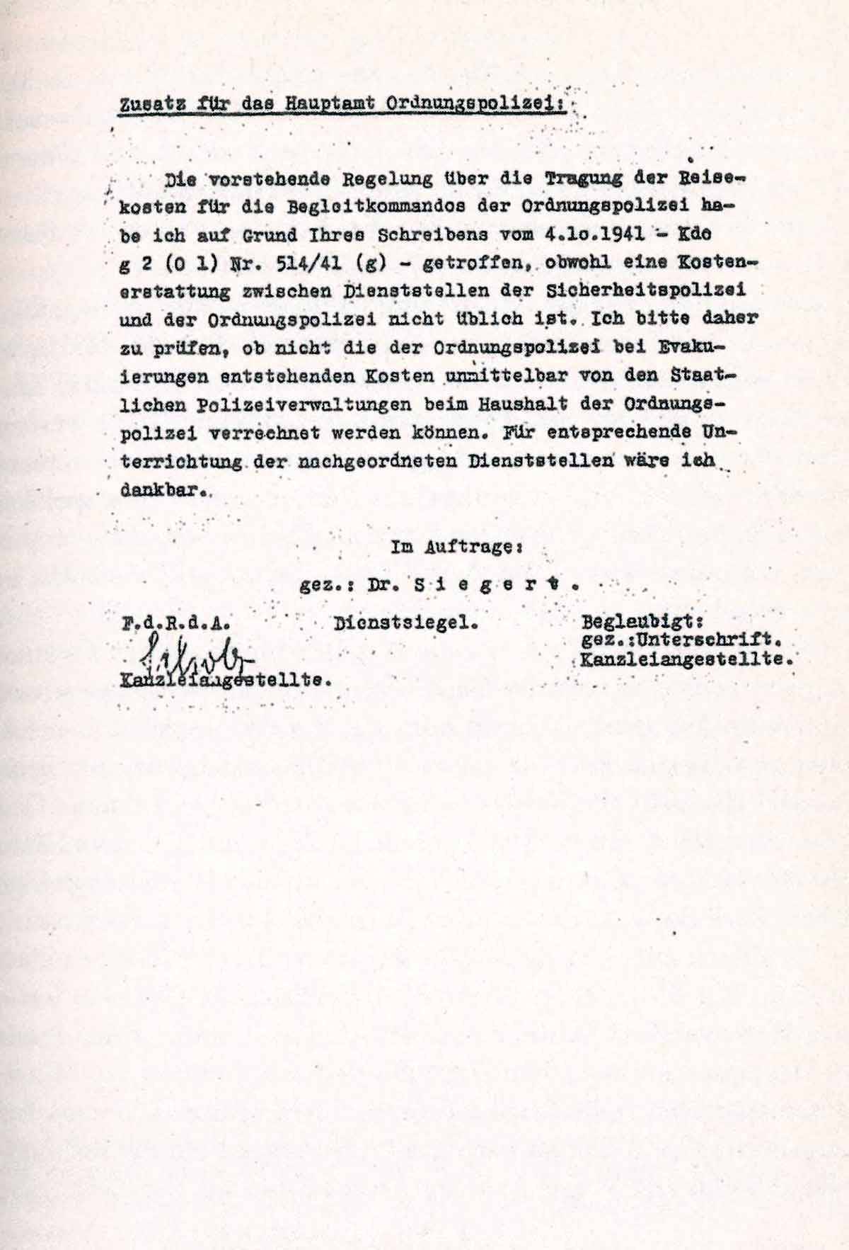 Die vorstehende Regelung über die Tragung der Reisekosten für die Begleitkommandos der Ordnungspolizei habe ich auf Grund Ihres Schreibens vom 4.10.1941 - Kdo g 2 (0 1) Nr. 514/41 (g) - getroffen, obwohl eine Kostenerstattung zwischen Dienststellen der Sicherheitspolizei und der Ordnungspolizei nicht üblich ist. Ich bitte daher zu prüfen, ob nicht die der Ordnungspolizei bei Evakuierungen entstehenden Kosten unmittelbar von den Staatlichen Polizeiverwaltungen beim Haushalt der Ordnungspolizei verrechnet werden können. Für entsprechende Unterrichtung der nachgeordneten Dienststellen wäre ich dankbar.