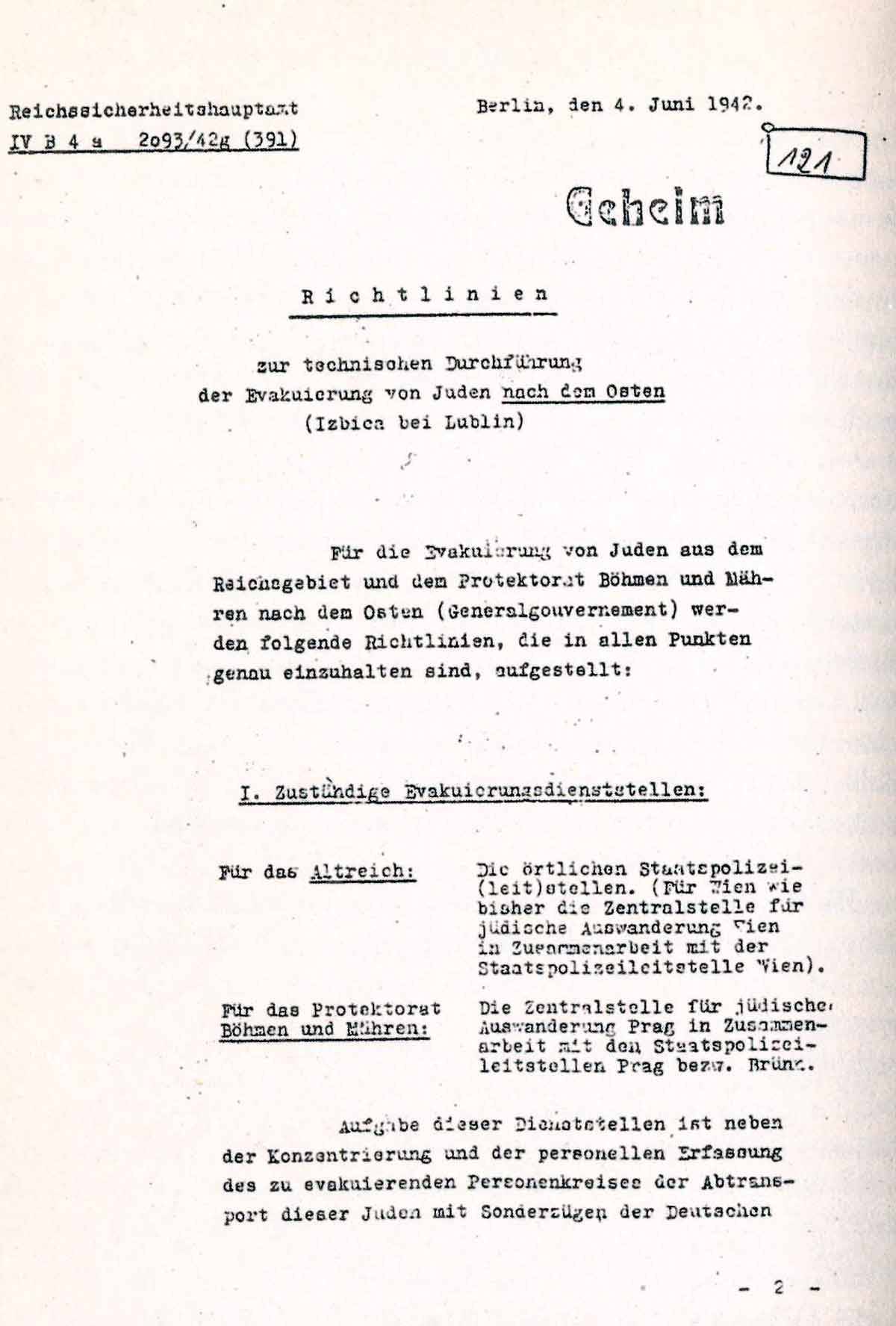 Die folgenden "Richtlinien zur technischen Durchführung der Evakuierung von Juden nach dem Osten (Izbica bei Lublin)" vom 4. Juni 1942 galten für die nächsten Monate der Judendeportation bis zum 20. Februar 1943: