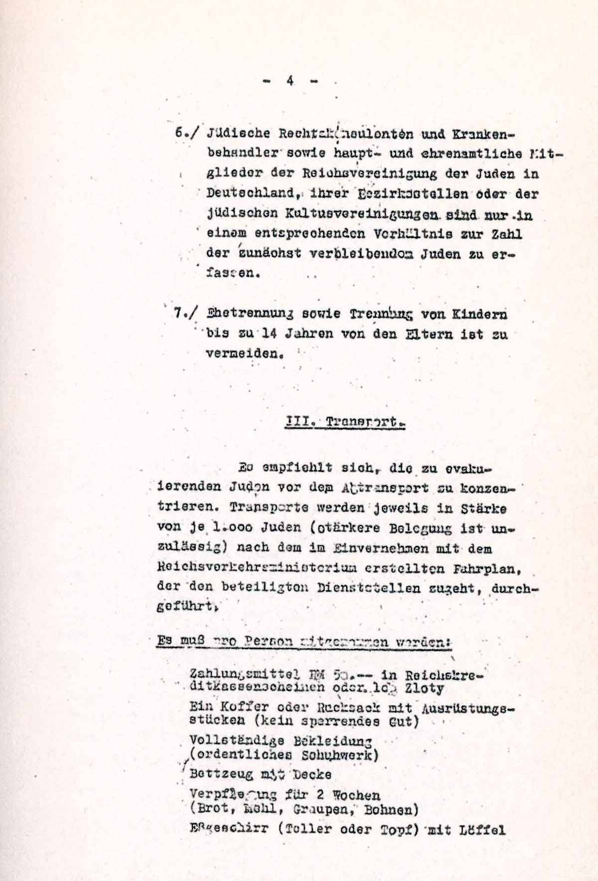 Es empfiehlt sich, die zu evakuierenden Juden vor dem Abtransport zu konzentrieren. Transporte werden jeweils in Stärke von je 1.000 Juden (stärkere Belegung ist unzulässig) nach dem im Einvernehmen mit dem Reichsverkehrsministerium erstellten Fahrplan, der den beteiligten Dienststellen zugeht, durchgeführt.