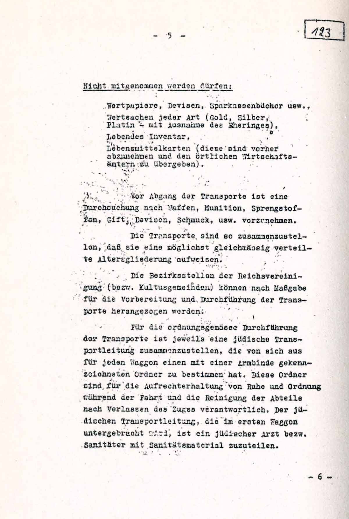 Für die ordnungsgemässe Durchführung der Transporte ist jeweils eine jüdische Transportleitung zusammenzustellen, die von sich aus für jeden Waggon einen mit einer Armbinde gekennzeichneten Ordner zu bestimmen hat. Diese Ordner sind für die Aufrechterhaltung von Ruhe und Ordnung während der Fahrt und die Reinigung der Abteile nach Verlassen des Zuges verantwortlich. Der jüdischen Transportleitung, die im ersten Waggon untergebracht wird, ist ein jüdischer Arzt bezw. Sanitäter mit Sanitätsmaterial zuzuteilen.