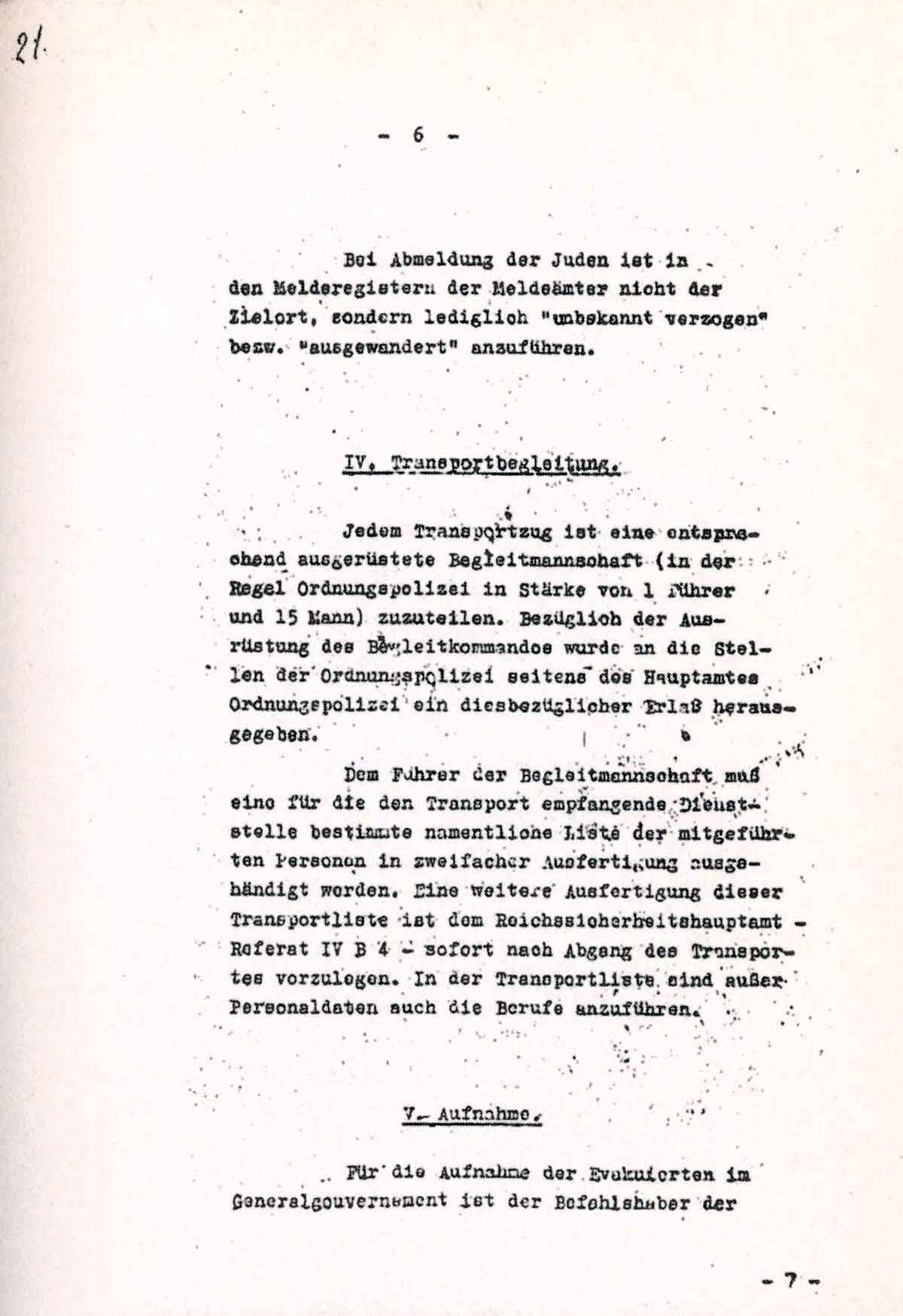 Dem Führer der Begleitmannschaft muß eine für die den Transport empfangende Dienststelle bestimmte namentliche Liste der mitgeführten Personen in zweifacher Ausfertigung ausgehändigt werden. Eine weitere Ausfertigung dieser Transportliste ist dem Reichssicherheitshauptamt - Referat IV B 4 - sofort nach Abgang des Transportes vorzulegen. In der Transportliste sind außer Personaldaten auch die Berufe anzuführen.