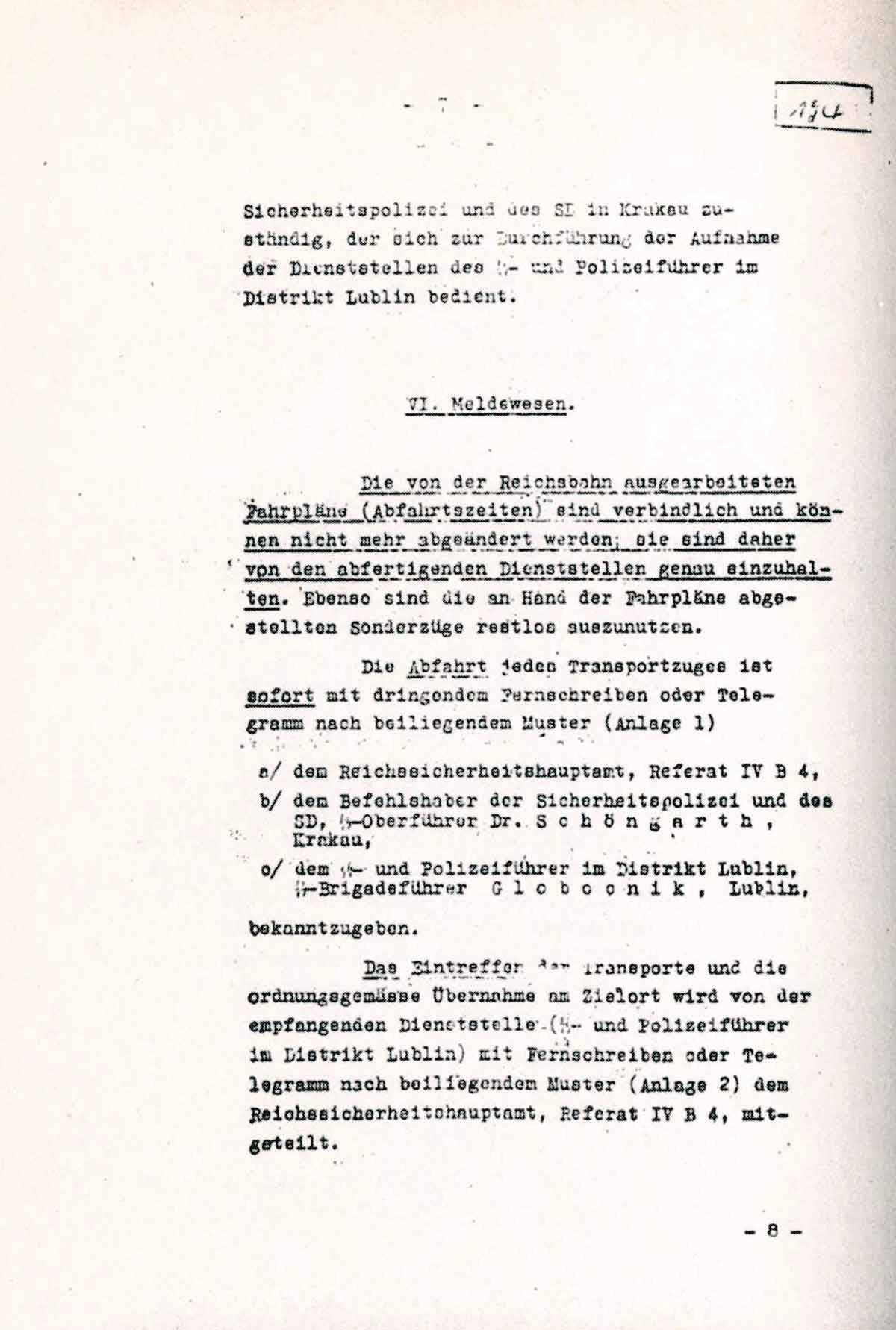 Das Eintreffen der Transporte und die ordnungsgemässe Übernahme am Zielort wird von der empfangenden Dienststelle (SS- und Polizeiführer im Distrikt Lublin) mit Fernschreiben oder Telegramm nach beiliegendem Muster (Anlage 2) dem Reichssicherheitshauptamt, Referat IV B 4, mitgeteilt.