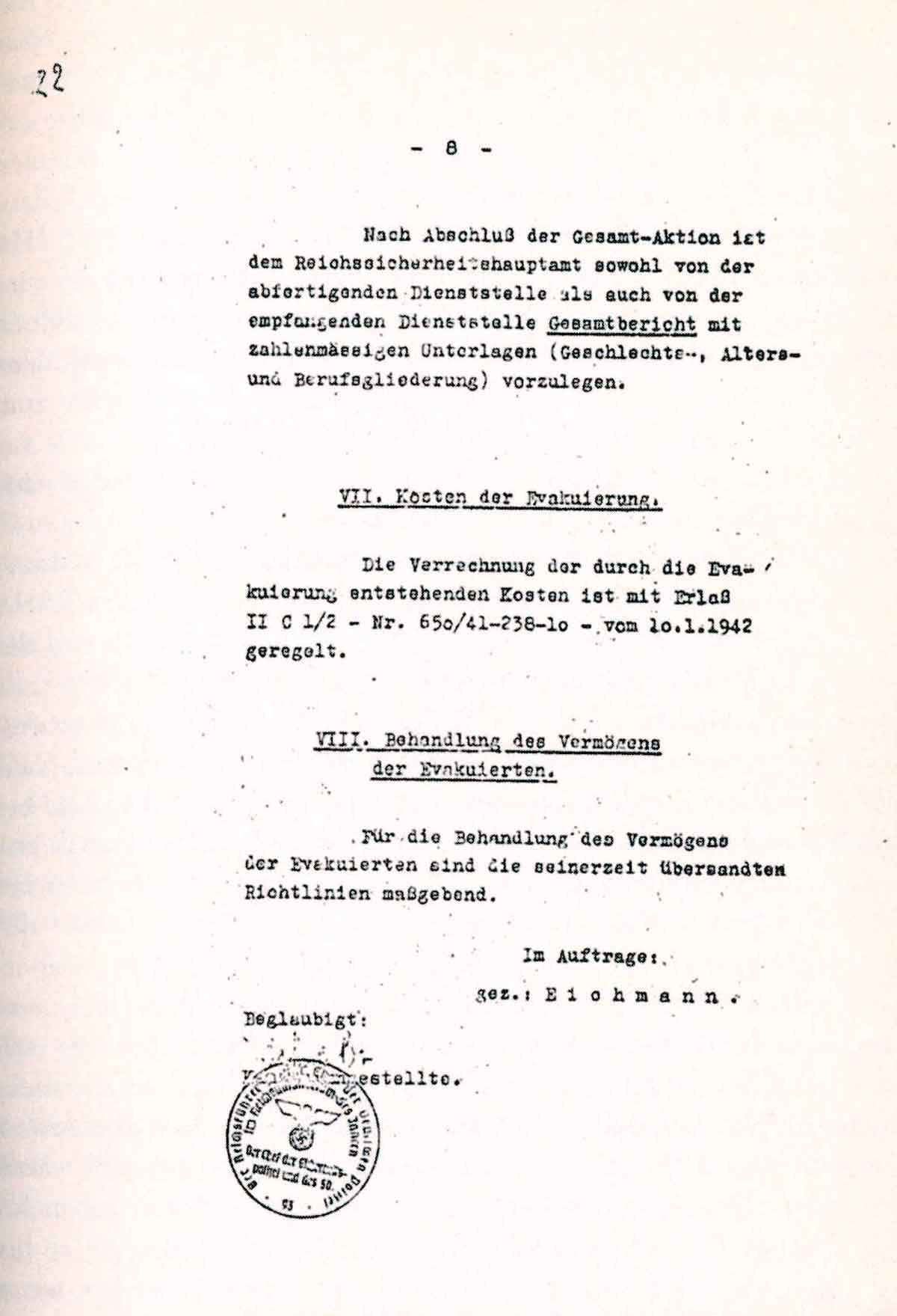 Nach Abschluß der Gesamt-Aktion ist dem Reichssicherheitshauptamt sowohl von der abfertigenden Dienststelle als auch von der empfangenden Dienststelle Gesamtbericht mit zahlenmässigen Unterlagen (Geschlechts-, Alters- und Berufsgliederung) vorzulegen.