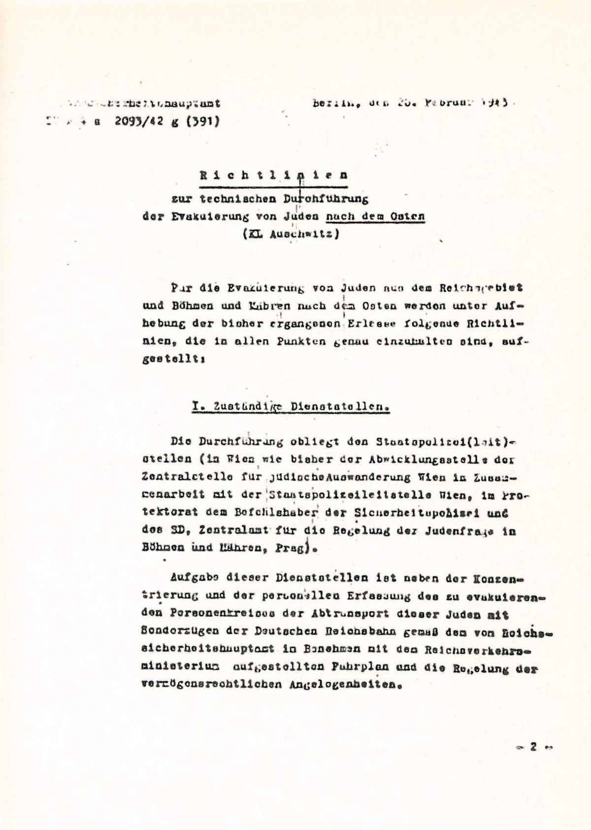Am 20. Februar 1943 erlässt das RSHA folgende "Richtlinien zur technischen Durchführung der Evakuierung von Juden nach dem Osten (KL Auschwitz)":