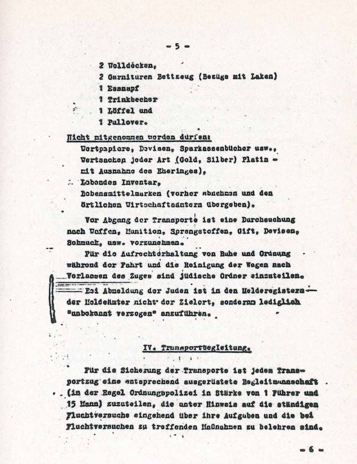Für die Sicherung der Transporte ist jedem Transportzug eine entsprechend ausgerüstete Begleitmannschaft (in der Regel Ordnungspolizei in Stärke von 1 Führer und 15 Mann) zuzuteilen, die unter Hinweis auf die ständigen Fluchtversuche eingehend über ihre Aufgaben und die bei Fluchtversuchen zu treffenden Maßnahmen zu belehren sind.