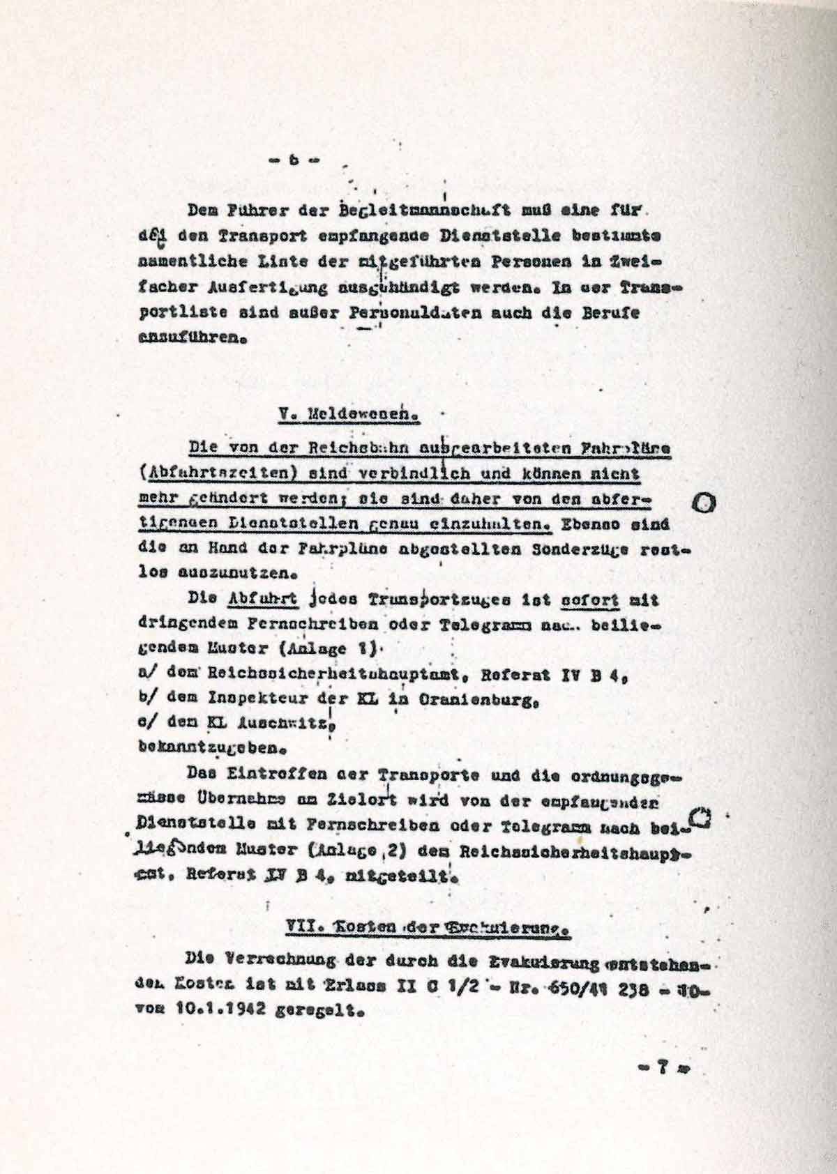 Das Eintreffen der Transporte und die ordnungsgemässe Übernahme am Zielort wird von der empfangenden Dienststelle mit Fernschreiben oder Telegramm nach beiliegendem Muster (Anlage 2) dem Reichssicherheitshauptamt, Referat IV B 4, mitgeteilt.