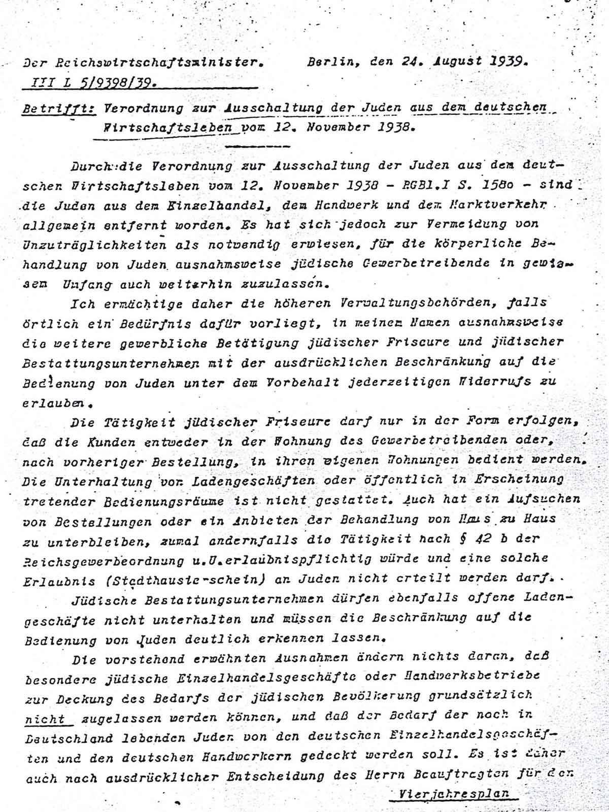Ich ermächtige daher die höheren Verwaltungsbehörden, falls örtlich ein Bedürfnis dafür vorliegt, in meinem Namen ausnahmsweise die weitere gewerbliche Betätigung jüdischer Friseure und jüdischer Bestattungsunternehmer mit der ausdrücklichen Beschränkung auf die Bedienung von Juden unter dem Vorbehalt jederzeitigen Widerrufs zu erlauben.