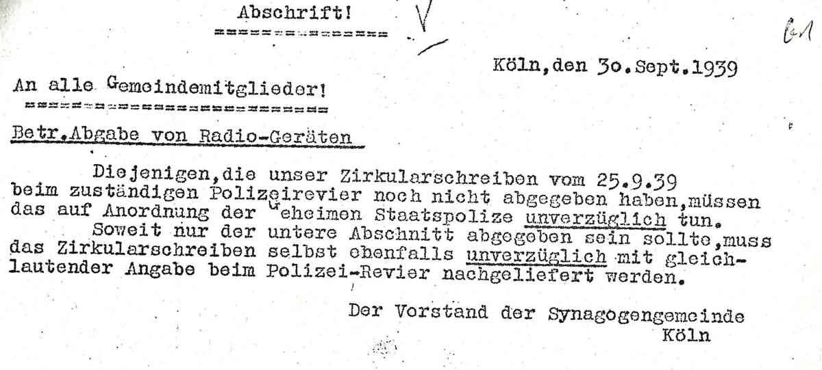 Am 30. September 1939 teilt die Kölner Synagogengemeinde ihren Mitgliedern mit: