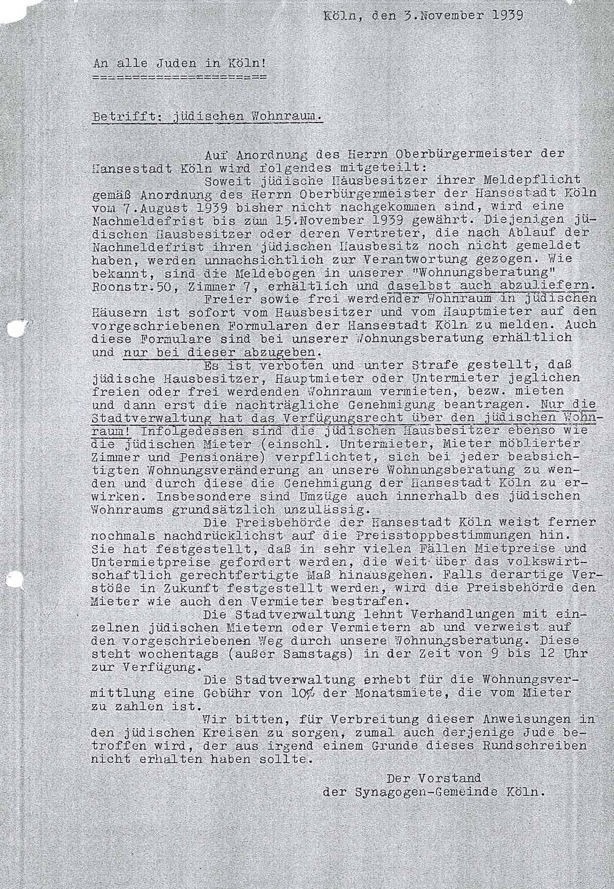 Es ist verboten und unter Strafe gestellt, daß jüdische Hausbesitzer, Hauptmieter oder Untermieter jeglichen freien oder frei werdenden Wohnraum vermieten, bezw. mieten und dann erst die nachträgliche Genehmigung beantragen. Nur die Stadtverwaltung hat das Verfügungsrecht über den jüdischen Wohnraum! Infolgedessen sind die jüdischen Hausbesitzer ebenso wie die jüdischen Mieter (einschl. Untermieter, Mieter möblierter Zimmer und Pensionäre) verpflichtet, sich bei jeder beabsichtigten Wohnungsveränderung an unsere Wohnungsberatung zu wenden und durch diese die Genehmigung der Hansestadt Köln zu erwirken. Insbesondere sind Umzüge auch innerhalb des jüdischen Wohnraums grundsätzlich unzulässig.