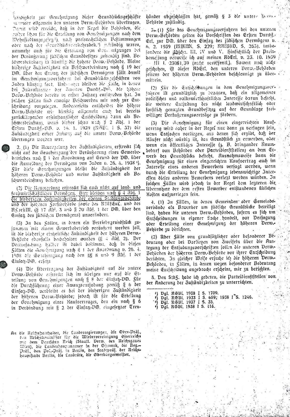 ständigkeit zur Genehmigung dieser Grundstücksgeschäfte nunmehr allgemein den unteren Verw.-Behörden übertragen. Dann wird erreicht, daß in der Regel die Behörden, die bisher schon für die Erteilung von Genehmigungen nach dem Wohnsiedlungsgesetz²) nach preisrechtlichen Bestimmungen oder nach der Grundstücksverkehrsbek.³) zuständig waren, nunmehr auch für die Erteilung von Genehmigungen bei der Veräußerung jüdischen Grundbesitzes zuständig sind. Beschwerdeinstanz ist künftig die höhere Verw.-Behörde. Meine bisherige Zuständigkeit als Beschwerdeinstanz nach § 19 der VO. über den Einsatz des jüdischen Vermögens fällt damit im Genehmigungsverfahren bei Grundstücksgeschäften von Juden künftig fort. Unb[..] bleiben die Fälle, in denen bei Inkrafttreten der Zweiten Durchf.-VO. die höhere Verw.-Behörde bereits in erster Instanz entschieden hat. In solchen Fällen sind etwaige Beschwerden mir noch zur Entscheidung vorzulegen. Andererseits entscheidet die höhere Verw.-Behörde wie künftig allgemein auch bei bereits zurückliegender erstinstanzlicher Entscheidung dann als Beschwerdeinstanz, wenn bisher schon nach § 2 Abs. 1 der Ersten Durchf.-VO. v. 16.1.1939 (RGBl. I S. 37) die Zuständigkeit erster Instanz auf die untere Verw.-Behörde übertragen worden war.