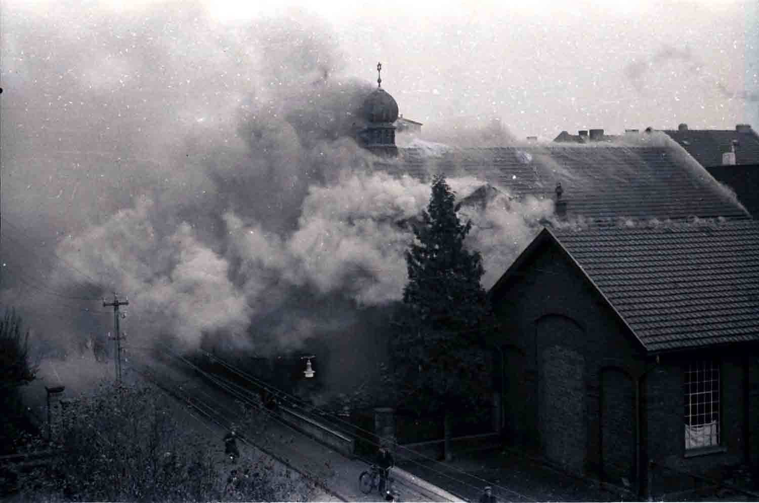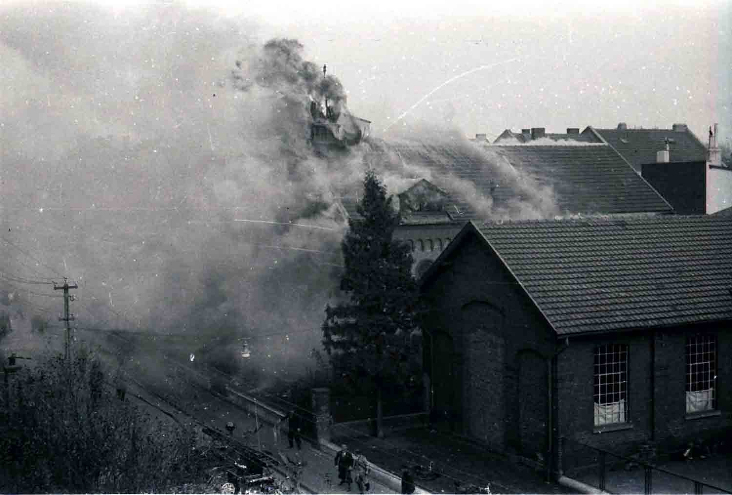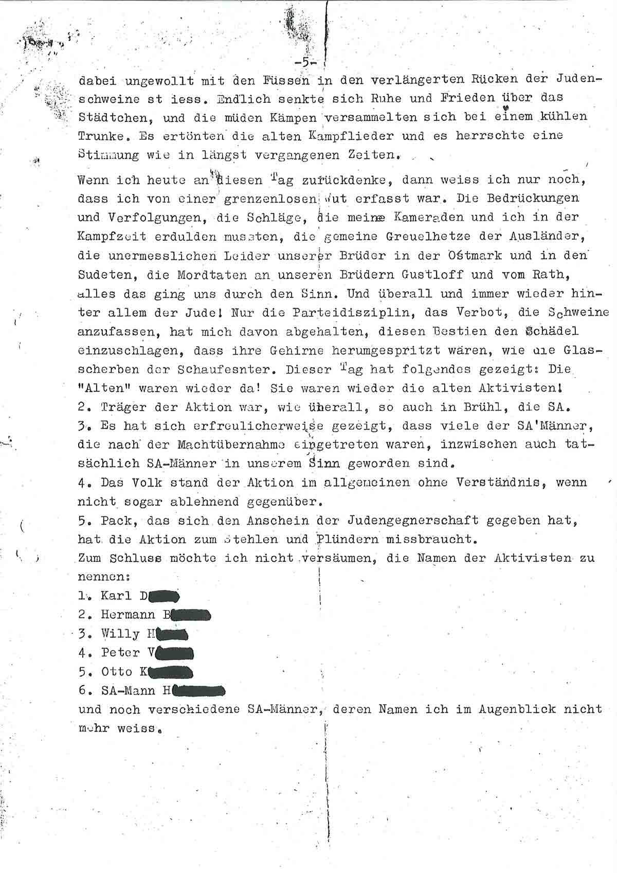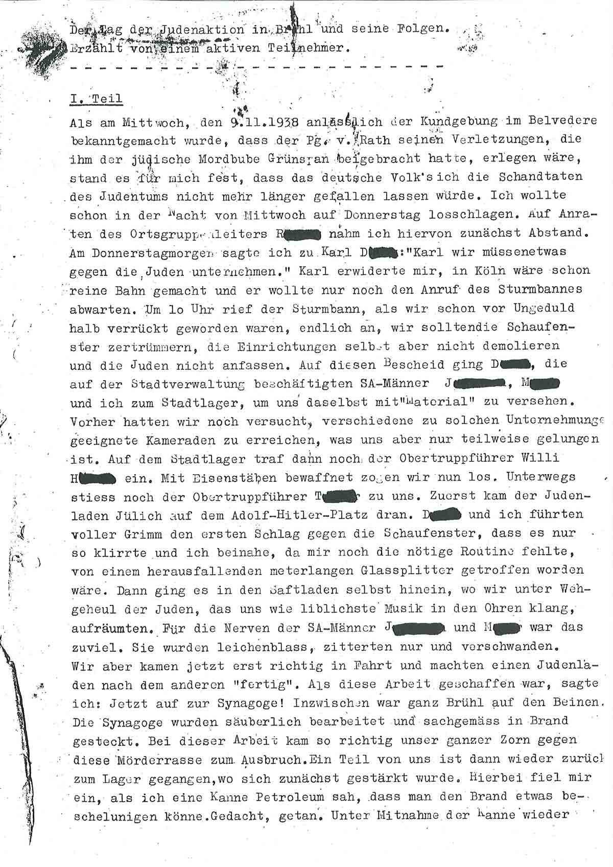 Wir aber kamen jetzt erst richtig in Fahrt und machten einen Judenladen nach dem anderen ‚fertig‘. Als diese Arbeit getan war, sagte ich: Jetzt auf zur Synagoge! Inzwischen war ganz Brühl auf den Beinen. Die Synagoge wurde säuberlich bearbeitet und sachgemäß in Brand gesteckt. Bei dieser Arbeit kam so richtig unser ganzer Zorn gegen diese Mörderrasse zum Ausbruch. Ein Teil von uns ist dann wieder zurück zum Lager gegangen, wo sich zunächst gestärkt wurde. Hierbei fiel mir ein, als ich eine Kanne Petroleum sah, dass man den Brand etwas beschleunigen könne. Gedacht, getan. Unter Mitnahme der Kanne wieder zurück zum Judentempel. Hier hatte sich eine große Volksmenge angesammelt, die uns (...), teils freudig und verständnisinnig, teils mit finsterer Miene verfolgte. Besonders die Kanne wurde mit großem Interesse betrachtet. In dem Judentempel war der Brand, den wir im ersten Stock angelegt hatten, schon so weit fortgeschritten, dass wir nur mit Mühe und Not und unter vielem Husten unser Petroleum ‚anbringen‘ konnten. Draußen sammelte sich immer mehr Volk an. Auch die hohe .Prominenz“ unter anderem Kreispropagandaleiter Pick, die Ortsgruppenleiter Rösing und Grenz, hatten sich eingefunden und betrachteten sachverständig das noch nie dagewesene Schauspiel. Plötzlich schlugen die hellen Flammen aus dem Dach heraus, und der Davidstern mit der Kuppel fiel in sich zusammen, um niemals wieder, solange Nationalsozialisten lebten, aufgerichtet zu werden. Das Feuer verbreitete sich jetzt mit rasender Geschwindigkeit. Das nördlich gelegene Nebenhaus geriet in Gefahr. Kreispropagandaleiter Pick wurde schon ganz aufgeregt. Ich sagte zu ihm: ‚Nur die Ruhe, Peter, die Feuerwehr ist immer im richtigen Moment zur Stelle!“ Und da kam die Feuerwehr, die bis dahin anderweitig verhindert war, schon angebraust und gab sich unter Mithilfe der in Zivil steckenden SA-Männer, die schon vorher vorbildlich den Verkehr auf der menschenüberfüllten Straße geregelt hatten, an die Arbeit. Wehrführer K. meldete dem Wehrführer B.: .Schadenfeuer in der Synagoge ausgebrochen, Ursache vermutlich Kurzschluss/An dem Nebenhaus ist durch das schnelle Eingreifen der Wehr nur ganz geringfügiger Brandschaden entstanden.