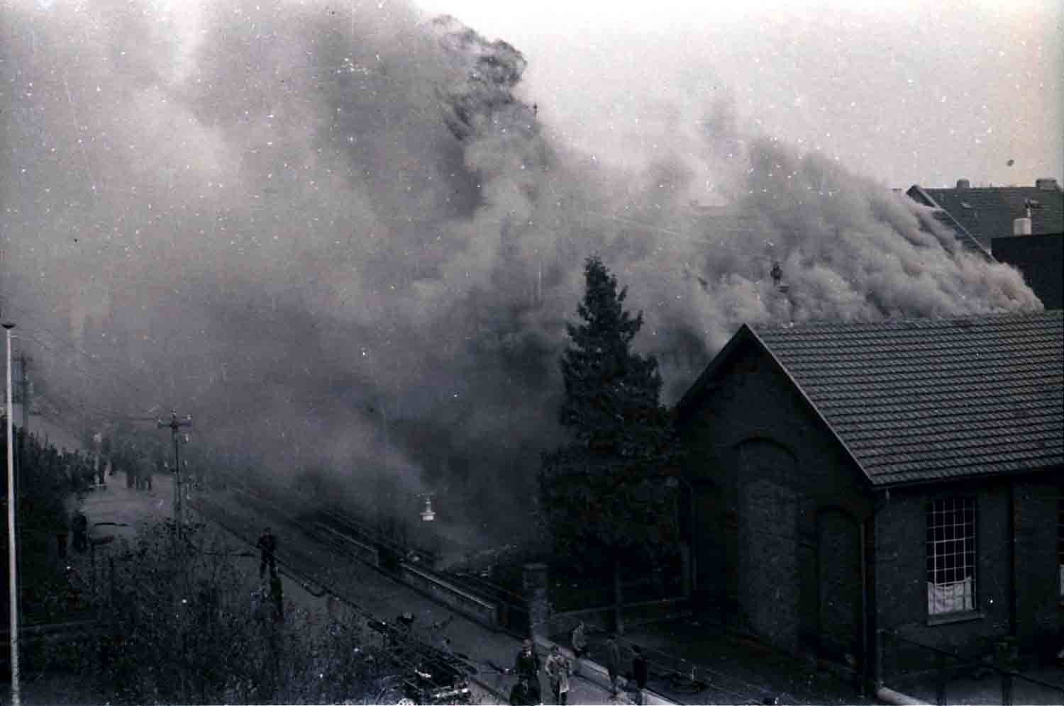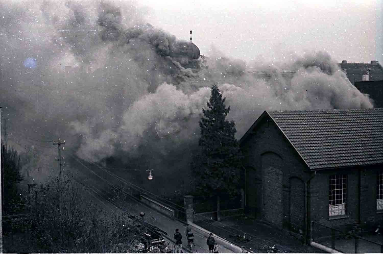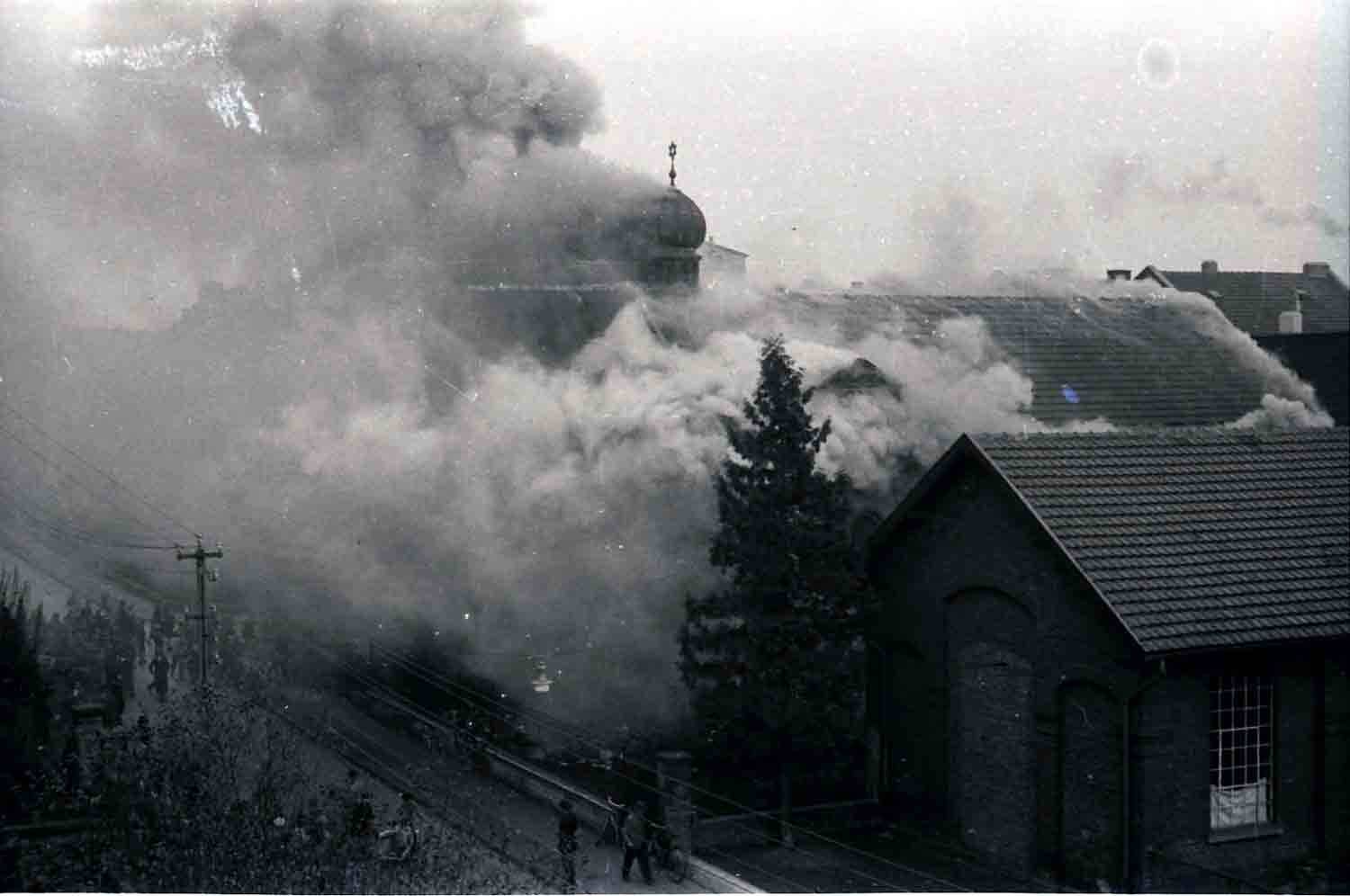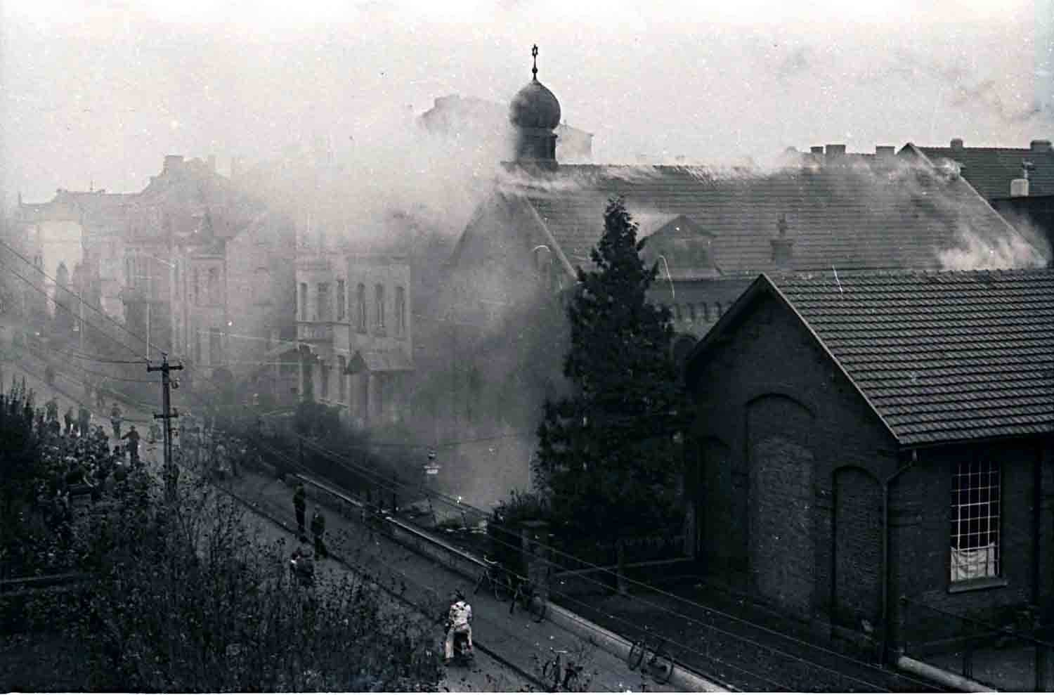 Wir aber kamen jetzt erst richtig in Fahrt und machten einen Judenladen nach dem anderen ‚fertig‘. Als diese Arbeit getan war, sagte ich: Jetzt auf zur Synagoge! Inzwischen war ganz Brühl auf den Beinen. Die Synagoge wurde säuberlich bearbeitet und sachgemäß in Brand gesteckt. Bei dieser Arbeit kam so richtig unser ganzer Zorn gegen diese Mörderrasse zum Ausbruch. Ein Teil von uns ist dann wieder zurück zum Lager gegangen, wo sich zunächst gestärkt wurde. Hierbei fiel mir ein, als ich eine Kanne Petroleum sah, dass man den Brand etwas beschleunigen könne. Gedacht, getan. Unter Mitnahme der Kanne wieder zurück zum Judentempel. Hier hatte sich eine große Volksmenge angesammelt, die uns (...), teils freudig und verständnisinnig, teils mit finsterer Miene verfolgte. Besonders die Kanne wurde mit großem Interesse betrachtet. In dem Judentempel war der Brand, den wir im ersten Stock angelegt hatten, schon so weit fortgeschritten, dass wir nur mit Mühe und Not und unter vielem Husten unser Petroleum ‚anbringen‘ konnten. Draußen sammelte sich immer mehr Volk an. Auch die hohe .Prominenz“ unter anderem Kreispropagandaleiter Pick, die Ortsgruppenleiter Rösing und Grenz, hatten sich eingefunden und betrachteten sachverständig das noch nie dagewesene Schauspiel. Plötzlich schlugen die hellen Flammen aus dem Dach heraus, und der Davidstern mit der Kuppel fiel in sich zusammen, um niemals wieder, solange Nationalsozialisten lebten, aufgerichtet zu werden. Das Feuer verbreitete sich jetzt mit rasender Geschwindigkeit. Das nördlich gelegene Nebenhaus geriet in Gefahr. Kreispropagandaleiter Pick wurde schon ganz aufgeregt. Ich sagte zu ihm: ‚Nur die Ruhe, Peter, die Feuerwehr ist immer im richtigen Moment zur Stelle!“ Und da kam die Feuerwehr, die bis dahin anderweitig verhindert war, schon angebraust und gab sich unter Mithilfe der in Zivil steckenden SA-Männer, die schon vorher vorbildlich den Verkehr auf der menschenüberfüllten Straße geregelt hatten, an die Arbeit. Wehrführer K. meldete dem Wehrführer B.: .Schadenfeuer in der Synagoge ausgebrochen, Ursache vermutlich Kurzschluss/An dem Nebenhaus ist durch das schnelle Eingreifen der Wehr nur ganz geringfügiger Brandschaden entstanden.