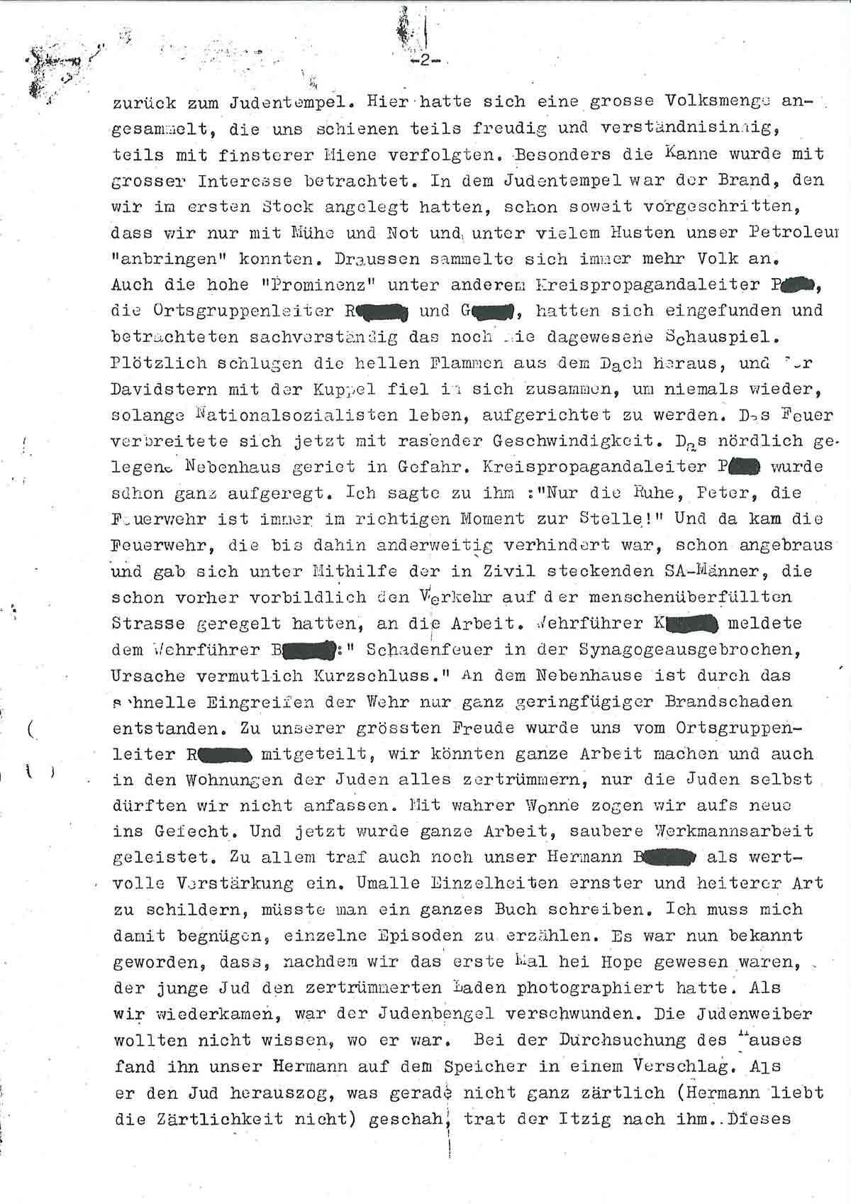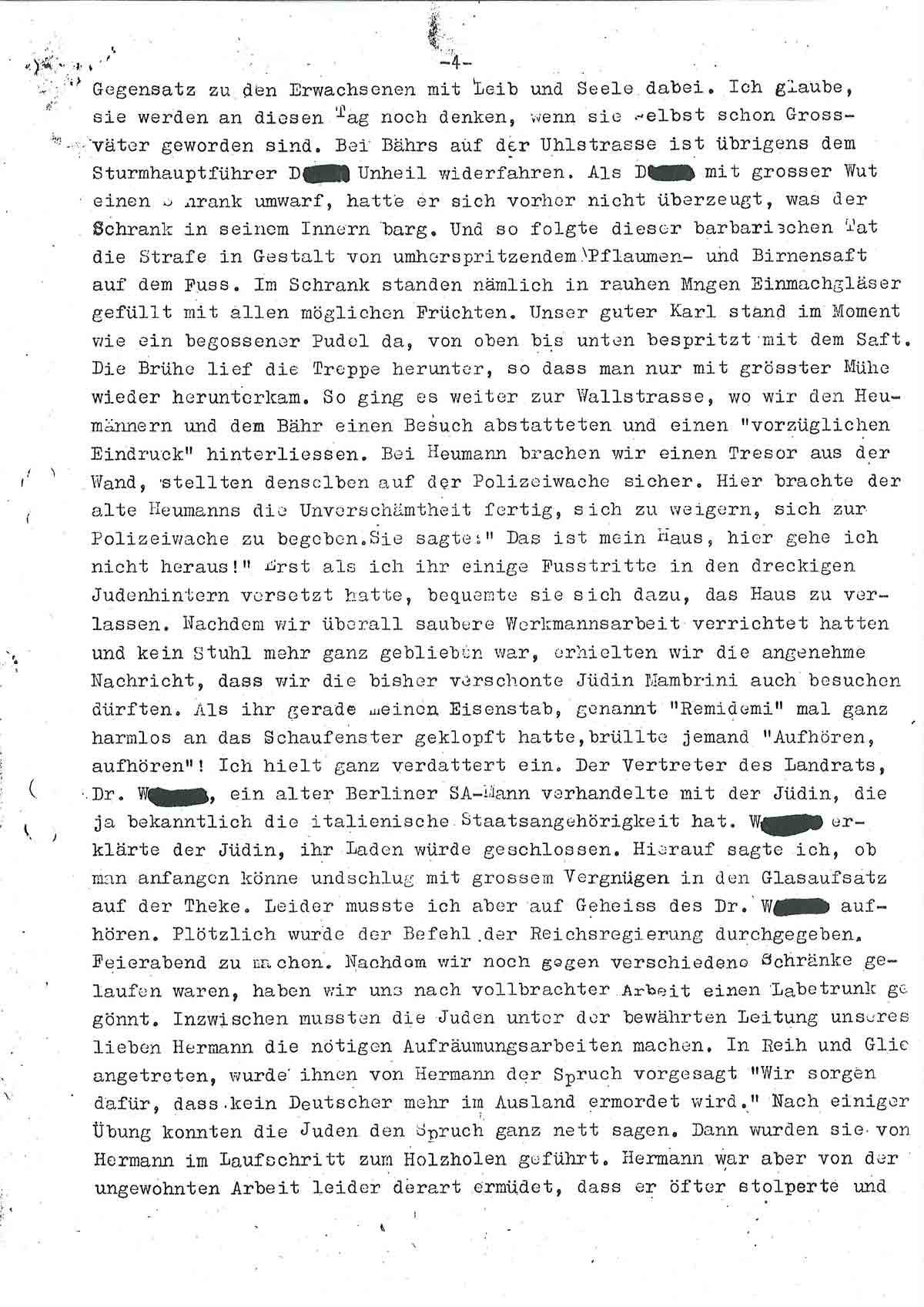 Nachdem wir überall saubere Werkmannsarbeit verrichtet hatten und kein Stuhl mehr ganz geblieben war, erhielten wir die angenehme Nachricht, dass wir die bisher verschonte Jüdin N.N. auch besuchen dürften. Als ich gerade meinen Eisenstab, genannt ‚Remidemi‘ mal ganz harmlos an das Schaufenster geklopft hatte, brüllte jemand ‚Aufhören, aufhören!‘ Ich hielt ganz verdattert ein. Der Vertreter des Landrats, Dr. Wagner, ein alter Berliner SA-Mann verhandelte mit der Jüdin, die ja bekanntlich die italienische Staatsangehörigkeit hat. Wagner erklärte der Jüdin, ihr Laden würde geschlossen. Hierauf sagte ich, ob man anfangen könne und schlug mit großem Vergnügen in den Glasaufsatz auf der Theke. Leider musste ich aber auf Geheiß des Dr. Wagner aufhören. Plötzlich wurde der Befehl der Reichsregierung durchgegeben, Feierabend zu machen. Nachdem wir noch gegen verschiedene Schränke gelaufen waren, haben wir uns nach vollbrachter Arbeit einen Labetrunk gegönnt. Inzwischen mussten die Juden unter der bewährten Leitung unseres lieben H. die nötigen Aufräumungsarbeiten machen. In Reih und Glied angetreten, wurde ihnen von H. der Spruch vorgesagt: ‚Wir sorgen dafür, dass kein Deutscher mehr im Ausland ermordet wird.‘ Nach einiger Übung konnten die Juden den Sprach ganz nett sagen. Dann wurden sie von H. im Laufschritt zum Holzholen geführt. H. war aber von der ungewohnten Arbeit leider derart ermüdet, dass er öfter stolperte und dabei ungewollt mit den Füssen in den verlängerten Rücken der Judenschweine stieß.