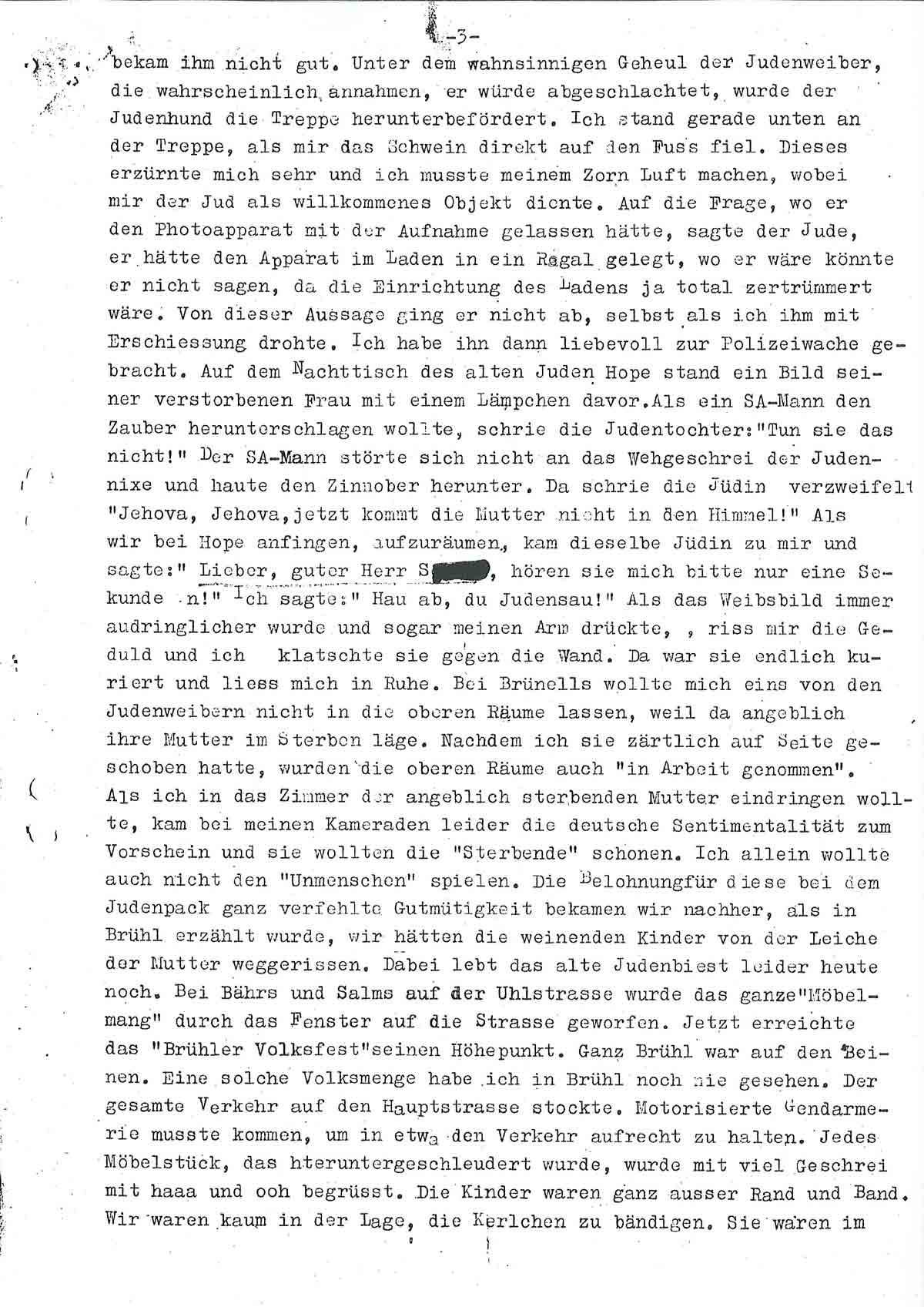 Es war nun bekannt geworden, dass, nachdem wir das erste Mal bei Hope gewesen waren, der junge Jud den zertrümmerten Laden photographiert hatte. Als wir wiederkamen, war der Judenbengel verschwunden. Die Judenweiber wollten nicht wissen, wo er war. Bei der Durchsuchung des Hauses fand ihn unser H. auf dem Speicher in einem Verschlag. Als er den Jud herauszog, was gerade nicht ganz zärtlich (H. liebt die Zärtlichkeit nicht) geschah, trat der Itzig nach ihm. Dieses bekam ihm nicht gut. Unter wahnsinnigem Geheul der Judenweiber, die wahrscheinlich annahmen, er würde abgeschlachtet, wurde der Judenhund die Treppe herunterbefördert. Ich stand gerade unten an der Treppe, als mir das Schwein direkt auf den Fuß fiel. Dieses erzürnte mich sehr und ich musste meinem Zorn Luft machen, wobei mir der Jud als willkommenes Objekt diente. Auf die Frage, wo der den Photoapparat mit der Aufnahme gelassen hätte, sagte der Jude, er hätte den Apparat im Laden in ein Regal gelegt, wo der wäre, könnte er nicht sagen, da die Einrichtung des Ladens ja total zertrümmert wäre. Von dieser Aussage ging er nicht ab, selbst als ich ihm mit Erschießung drohte. Ich habe ihn dann liebevoll zur Polizeiwache gebracht. Auf dem Nachttische des alten Juden Hope stand ein Bild seiner verstorbenen Frau mit einem Lämpchen davor. Als ein SA-Mann den Zauber herunterschlagen wollte, schrie die Judentochter: ,Tun Sie das nicht!“ Der SA-Mann störte sich nicht an dem Wehgeschrei der Judennixe und haute den Zinnober herunter. Da schrie die Jüdin verzweifelt Jehova, Jehova, jetzt kommt die Mutter nicht in den Himmel!“ Als wir bei Hope anfingen, aufzuräumen, kam dieselbe Jüdin zu mir und sagte: .Lieber guter Herr S., hören Sie mich bitte nur eine Sekunde an!“ Ich sagte: ‚Hau ab, du Judensau!“ Als das Weibsbild immer aufdringlicher wurde und sogar meinen Arm drückte, riss mir die Geduld und ich klatschte sie gegen die Wand. Da war sie endlich kuriert und ließ mich in Ruhe.