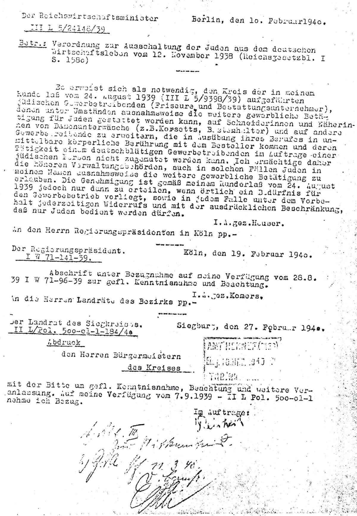 Es erweist sich als notwendig, den Kreis der in meinem Runderlaß vom 24. August 1939 (III L 5/9398/39) aufgeführten jüdischen Gewerbetreibenden (Friseure und Bestattungsunternehmer), denen unter Umständen ausnahmsweise die weitere gewerbliche Betätigung für Juden gestattet werden kann, auf Schneiderinnen und Näherinnen von Damenunterwäsche (z. B. Korsetts, Büstenhalter) und auf andere Gewerbetreibende zu erweitern, die in Ausübung ihres Berufes in unmittelbare körperliche Berührung mit dem Besteller kommen und deren Tätigkeit einem deutschblütigen Gewerbetreibenden im Auftrage einer jüdischen Person nicht zugemutet werden kann. Ich ermächtige daher die höheren Verwaltungsbehörden, auch in solchen Fällen Juden in meinem Namen ausnahmsweise die weitere gewerbliche Betätigung zu erlauben. Die Genehmigung ist gemäß meinem Runderlaß vom 24. August 1939 jedoch nur dann zu erteilen, wenn örtlich ein Bedürfnis für den Gewerbebetrieb vorliegt, sowie in jedem Falle unter dem Vorbehalt jederzeitigen Widerrufs und mit der ausdrücklichen Beschränkung, daß nur Juden bedient werden dürfen.