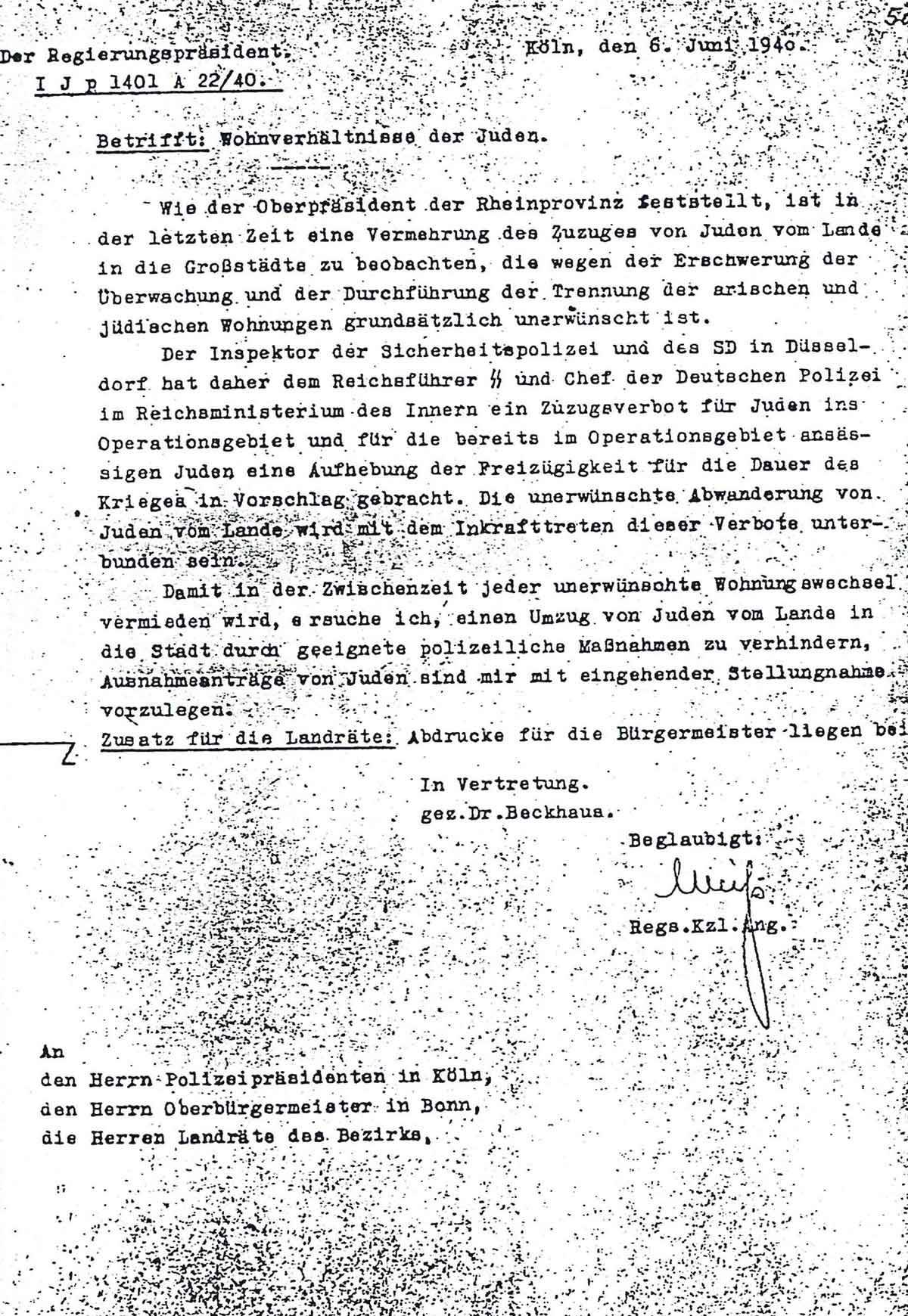 Wie der Oberpräsident der Rheinprovinz feststellt, ist in der letzten Zeit eine Vermehrung des Zuzuges von Juden vom Lande in die Großstädte zu beobachten, die wegen der Erschwerung der Überwachung und der Durchführung der Trennung der arischen und jüdischen Wohnungen grundsätzlich unerwünscht ist.