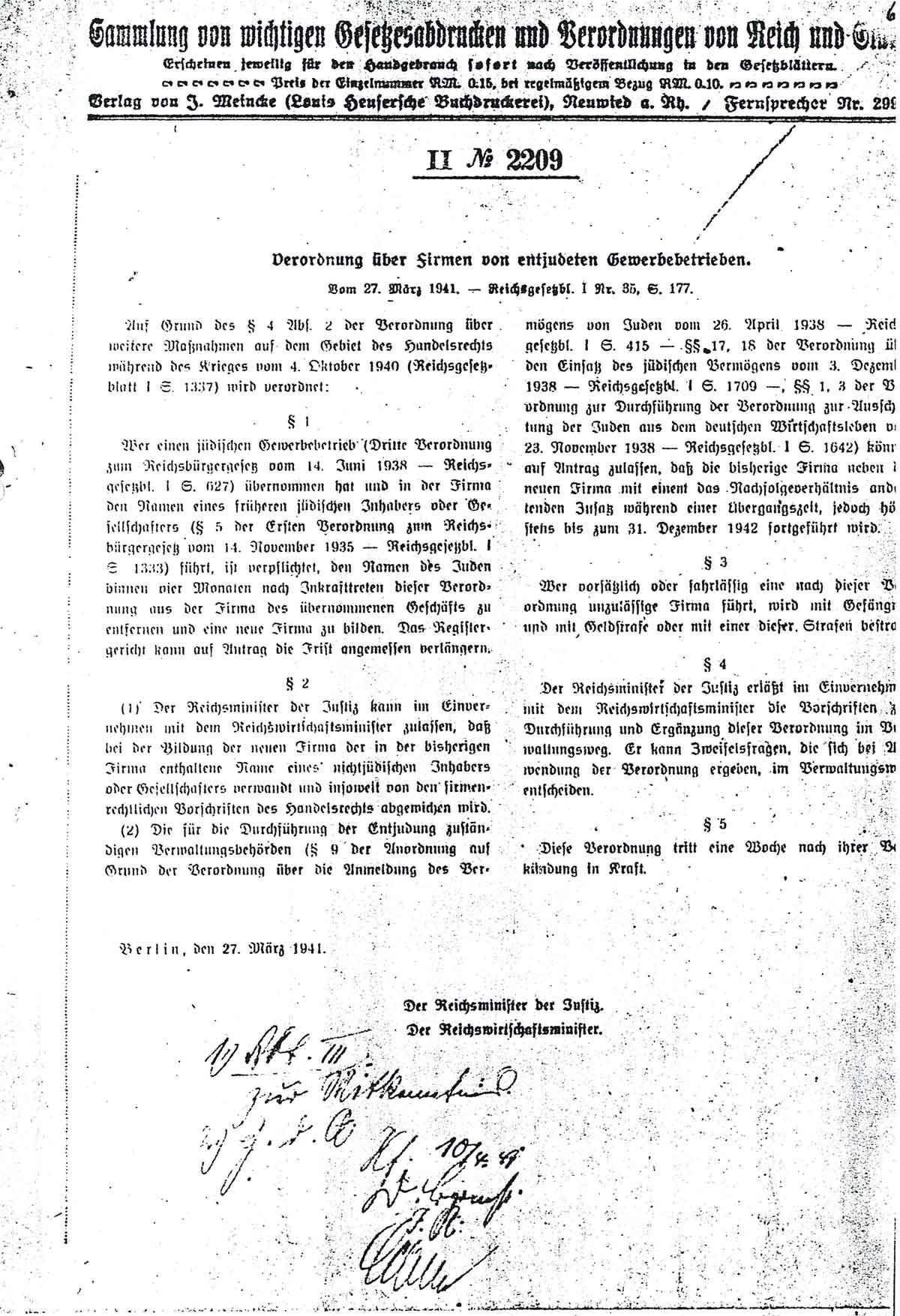 Am 27. März 1941 erlassen Reichswirtschaftsminister und Reichsjustizminister folgende Verordnung: