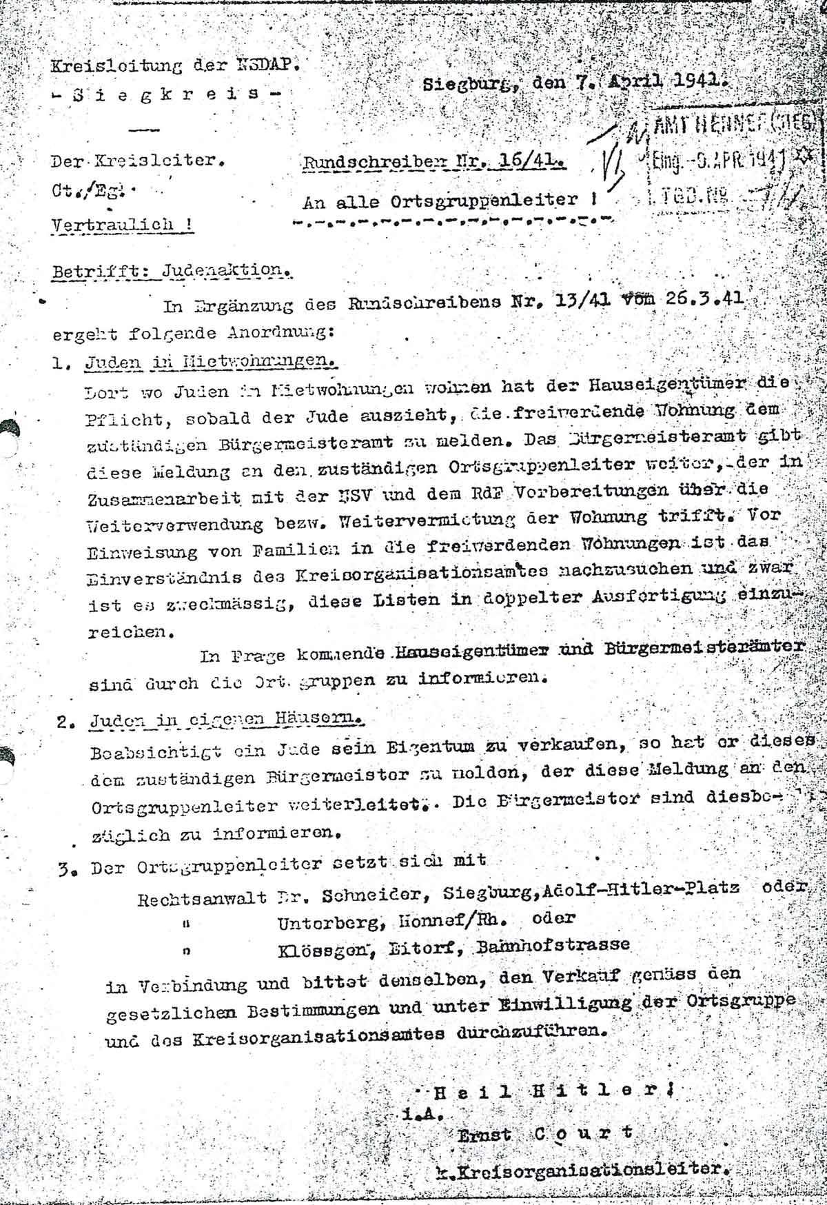 Am 7. April 1941 verschickt die NSDAP-Kreisleitung Siegburg folgendes Rundschreiben 16/41 an alle Ortsgruppenleiter: