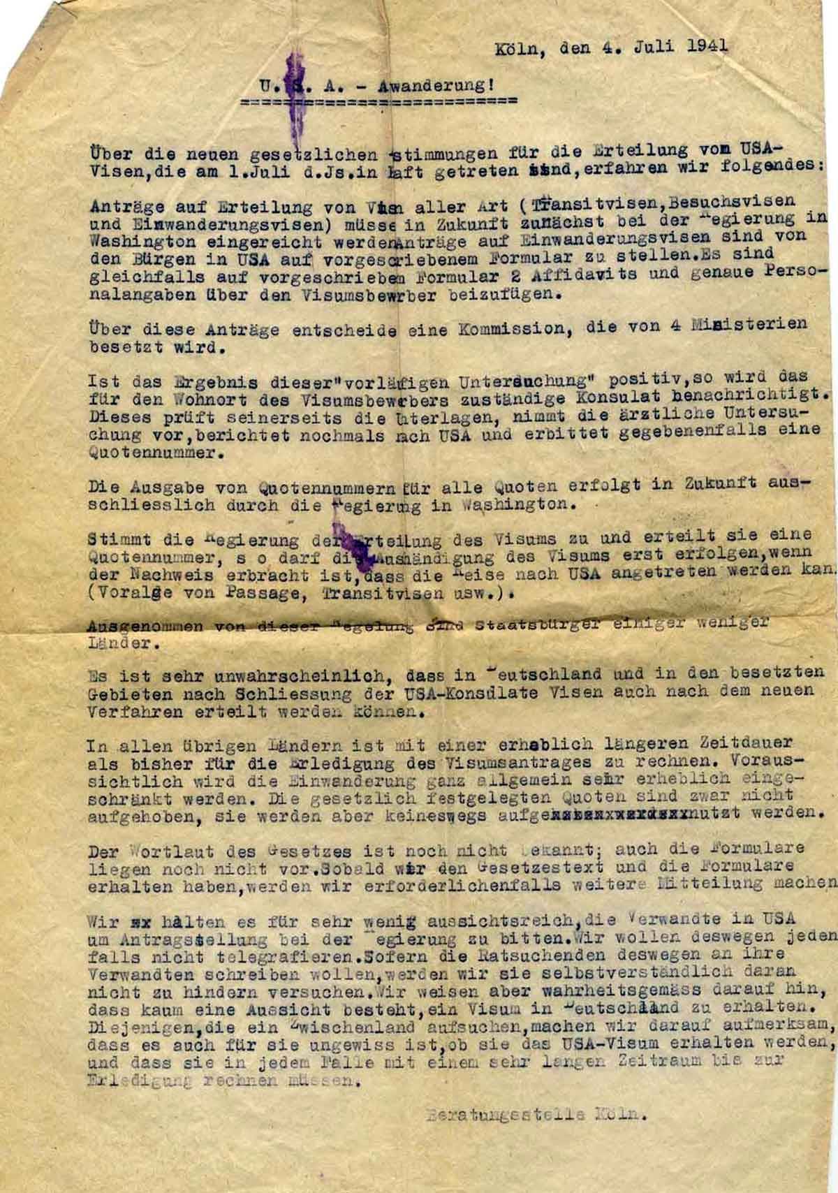 Die Beratungsstelle der Jüdischen Gemeinde Köln veröffentlicht am 4. Juli 1941 folgendes Papier: