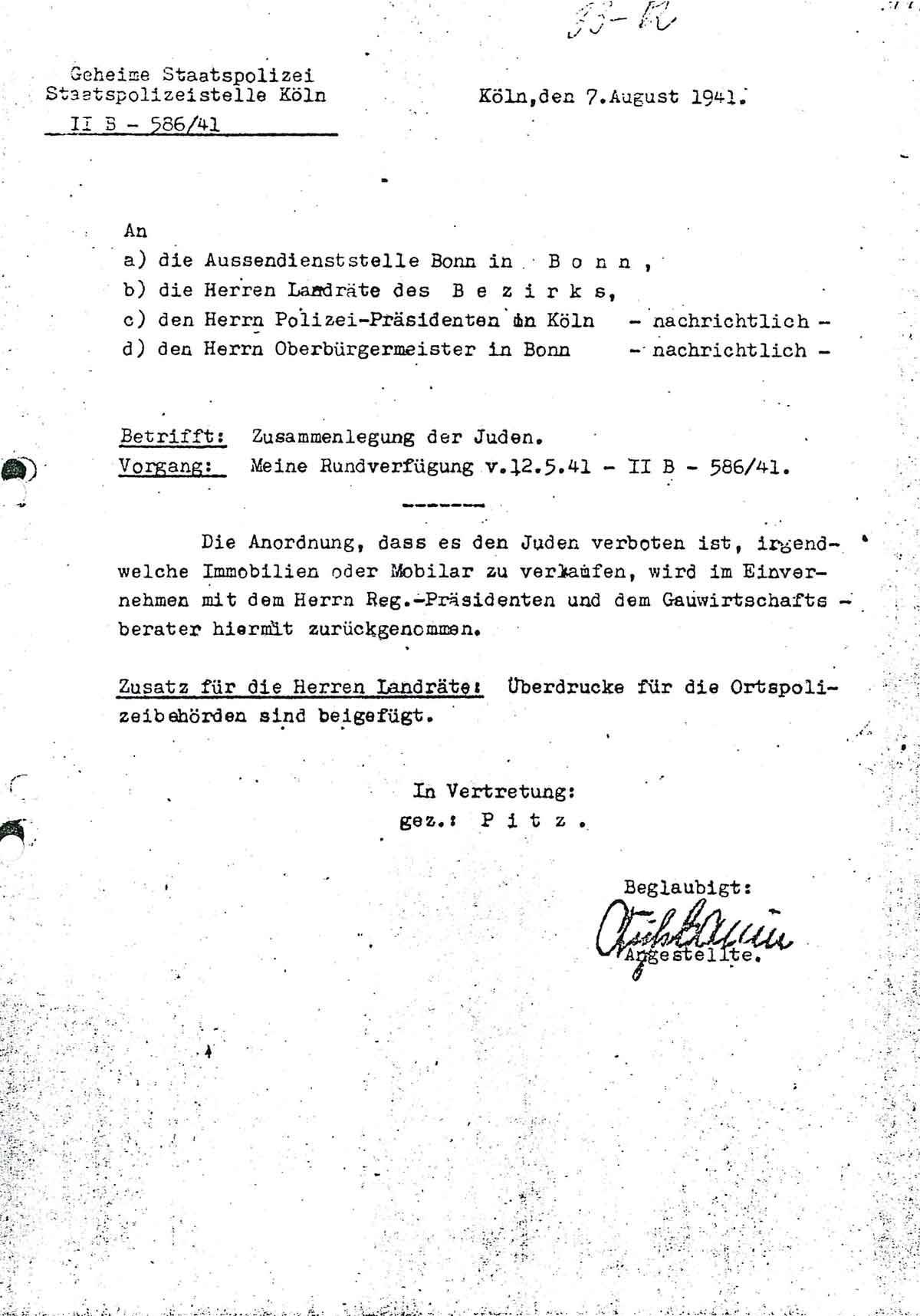 Am 7. August 1941 teilt die Gestapo Köln Folgendes mit: