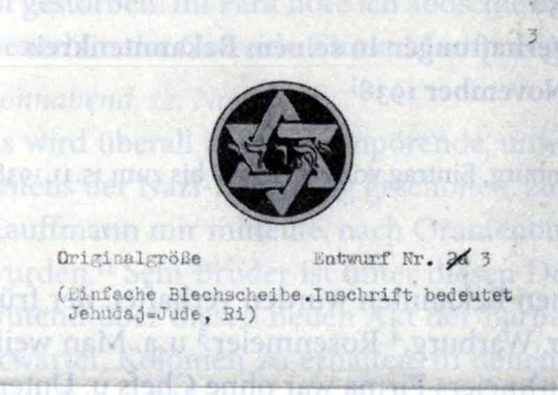 Entwurf3 stellt den jüdischen Sechsstern in blauer Farbe auf schwarzem Grunde dar, durch einen schmalen gelben Streifen eingerahmt. In Querschrift ist in der Mitte des jüdischen Sechssterns das Wort ‚Jehudaj‘, (hebräisch) = Jude, aufgetragen.