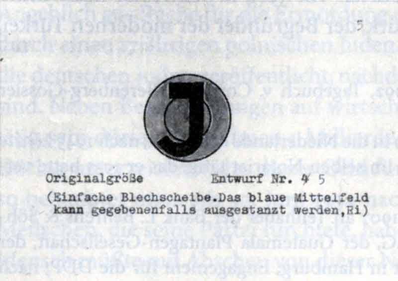 Entwurf 4 stellt einen Weinen Kreis dar, der mit blauer Farbe ausgefüllt und von einem Ring in gelber Farbe umgeben ist. Auf das Abzeichen ist senkrecht in schwarzer Farbe in Fraktur-Schrift der Buchstabe ,J‘ aufgetragen.