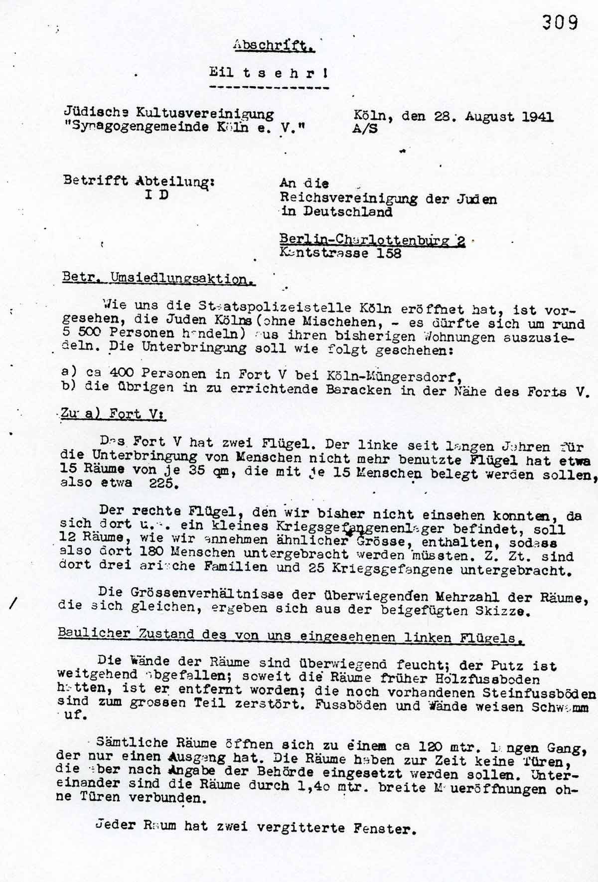 Am 28. August 1941 gibt die Synagogengemeinde Köln folgende Information an die Reichsvereinigung in Berlin weiter: