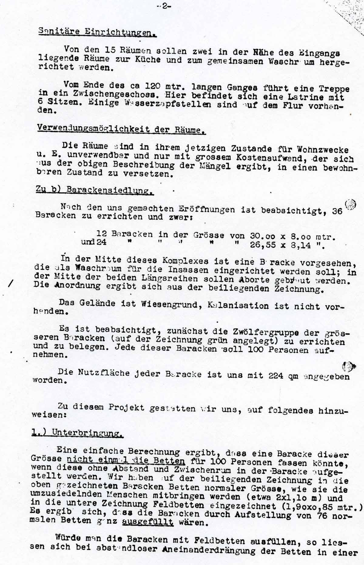 In der Mitte dieses Komplexes ist eine Baracke vorgesehen, die als Waschraum für die Insassen eingerichtet werden soll; in der Mitte der beiden Längsreihen sollen Aborte gebaut werden. Die Anordnung ergibt sich aus der beiliegenden Zeichnung.