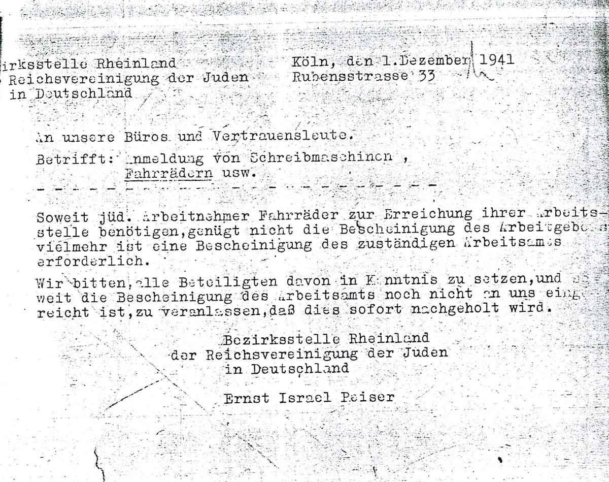 Am 1. Dezember 1941 teilt die Bezirksstelle Rheinland der Reichsvereinigung den angeschlossenen Büros Folgendes zum Thema "Anmeldung von Schreibmaschinen, Fahrrädern usw." Folgendes mit: