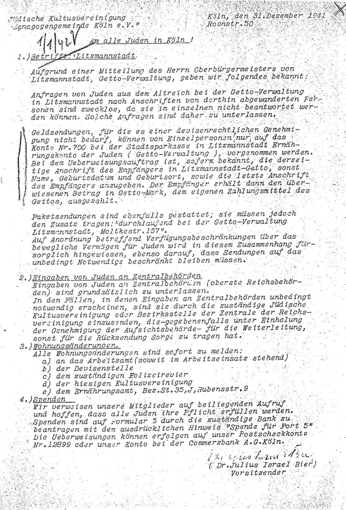 Jüdische Kultusvereinigung                                 Köln, den 31. Dezember 1941