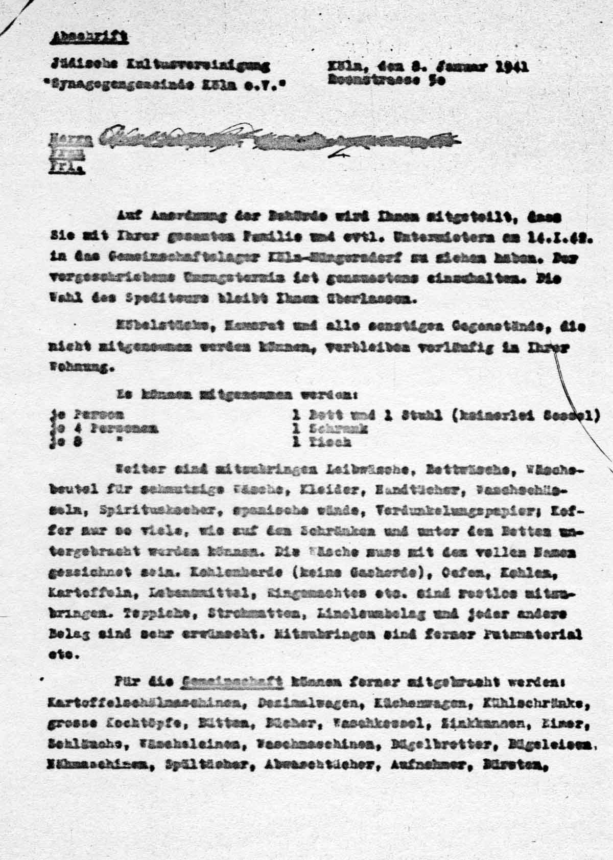 Auf Anordnung der Behörde wird Ihnen mitgeteilt, dass Sie mit Ihrer gesamten Familie und evtl. Untermietern am 14.I.41. in das Gemeinschaftslager Köln-Müngersdorf zu ziehen haben. Der vorgeschriebene Umzugstermin ist genauestens einzuhalten. Die Wahl des Spediteurs bleibt Ihnen überlassen.