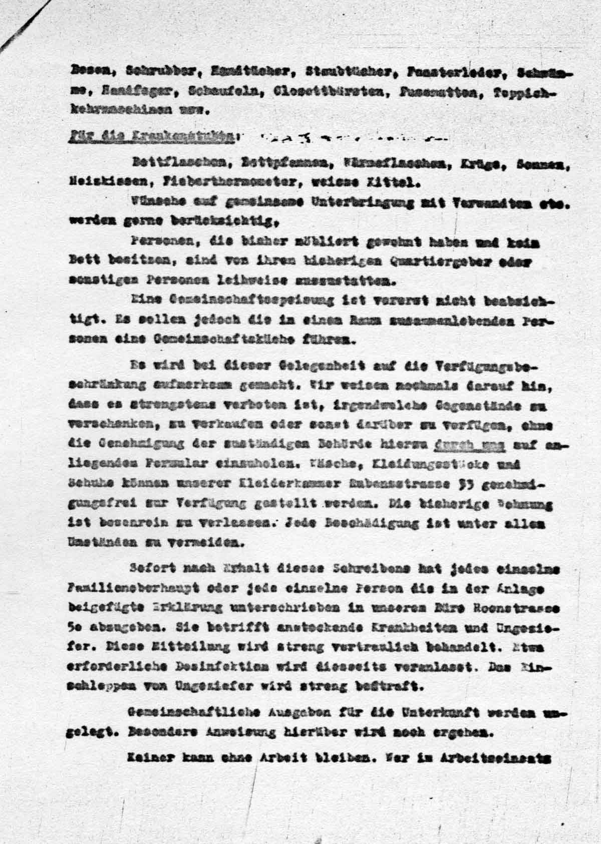 Es wird bei dieser Gelegenheit auf die Verfügungsbeschränkung aufmerksam gemacht. Wir weisen nochmals darauf hin, dass es strengstens verboten ist, irgendwelche Gegenstände zu verschenken, zu verkaufen oder sonst darüber zu verfügen, ohne die Genehmigung der zuständigen Behörde hierzu durch uns auf anliegendem Formular einzuholen. Wäsche, Kleidungsstücke und Schuhe können unserer Kleiderkammer Rubensstrasse 33 genehmigungsfrei zur Verfügung gestellt werden. Die bisherige Wohnung ist besenrein zu verlassen. Jede Beschädigung ist unter allen Umständen zu vermeiden.