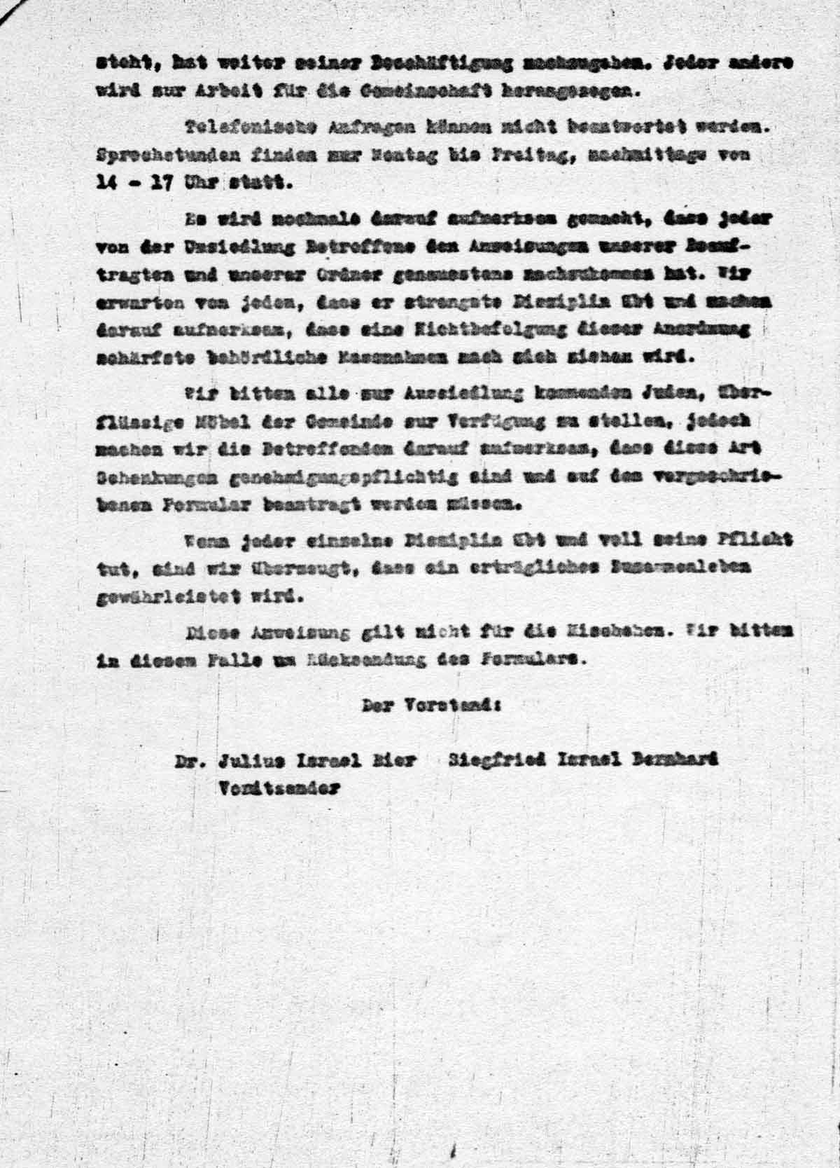 Wir bitten alle zur Aussiedlung kommenden Juden, überflüssige Möbel der Gemeinde zur Verfügung zu stellen, jedoch machen wir Betreffenden darauf aufmerksam, dass diese Art Schenkungen genehmigungspflichtig sind und auf dem vorgeschriebenen Formular beantragt werden müssen.