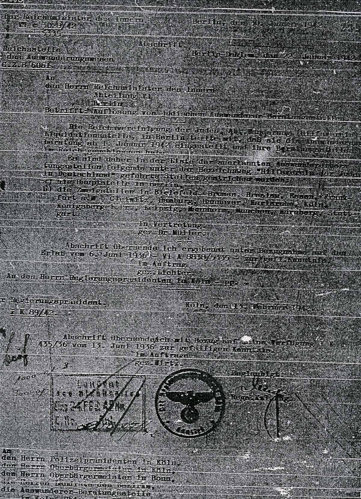 Die Reichsvereinigung der Juden „Abt. Wanderung (Hilfsverein) Liquidationsstelle, in Berlin teilte mit, daß sie die Auswanderungsberatung ab 1. Januar 1942 eingestellt und ihre Beratungsstelle im Reich geschlossen habe.
