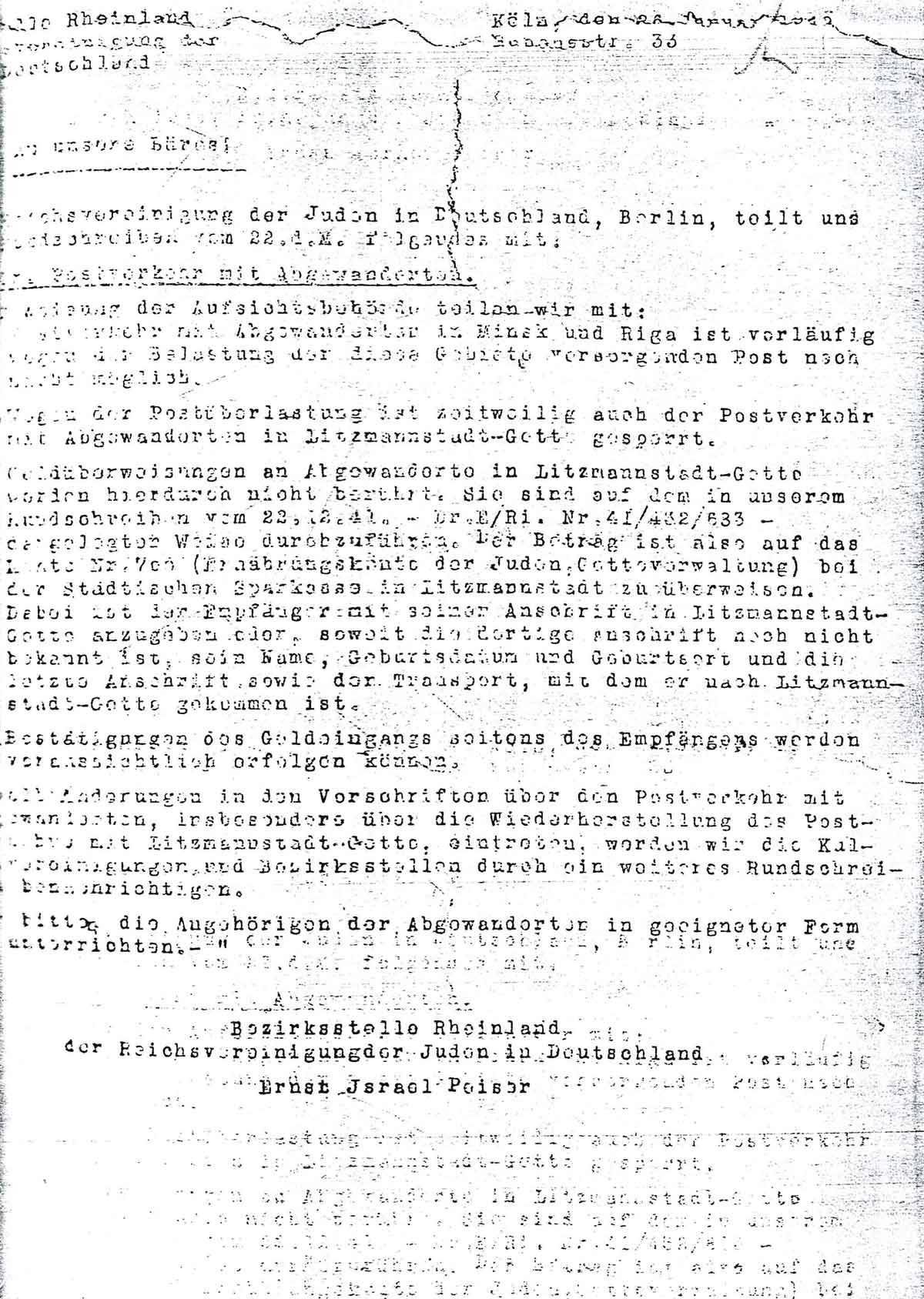Wenn Änderungen in den Vorschriften über den Postverkehr mit Abgewanderten, insbesondere über die Wiederherstellung des Postverkehrs mit Litzmannstadt-Getto, eintreten, werden wir die [..]vereinigungen und Bezirksstellen durch ein weiteres Rundschreiben benachrichtigen.