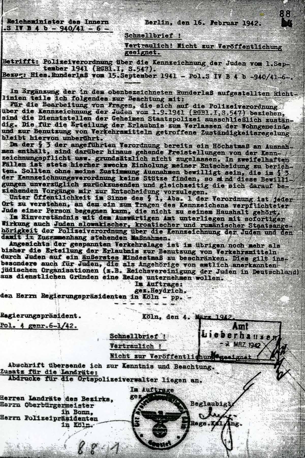 Im Einverständnis mit dem Auswärtigen Amt unterliegen mit sofortiger Wirkung auch Juden slowakischer, kroatischer und rumänischer Staatsangehörigkeit der Polizeiverordnung über die Kennzeichnung der Juden und den damit im Zusammenhang stehenden Maßnahmen.