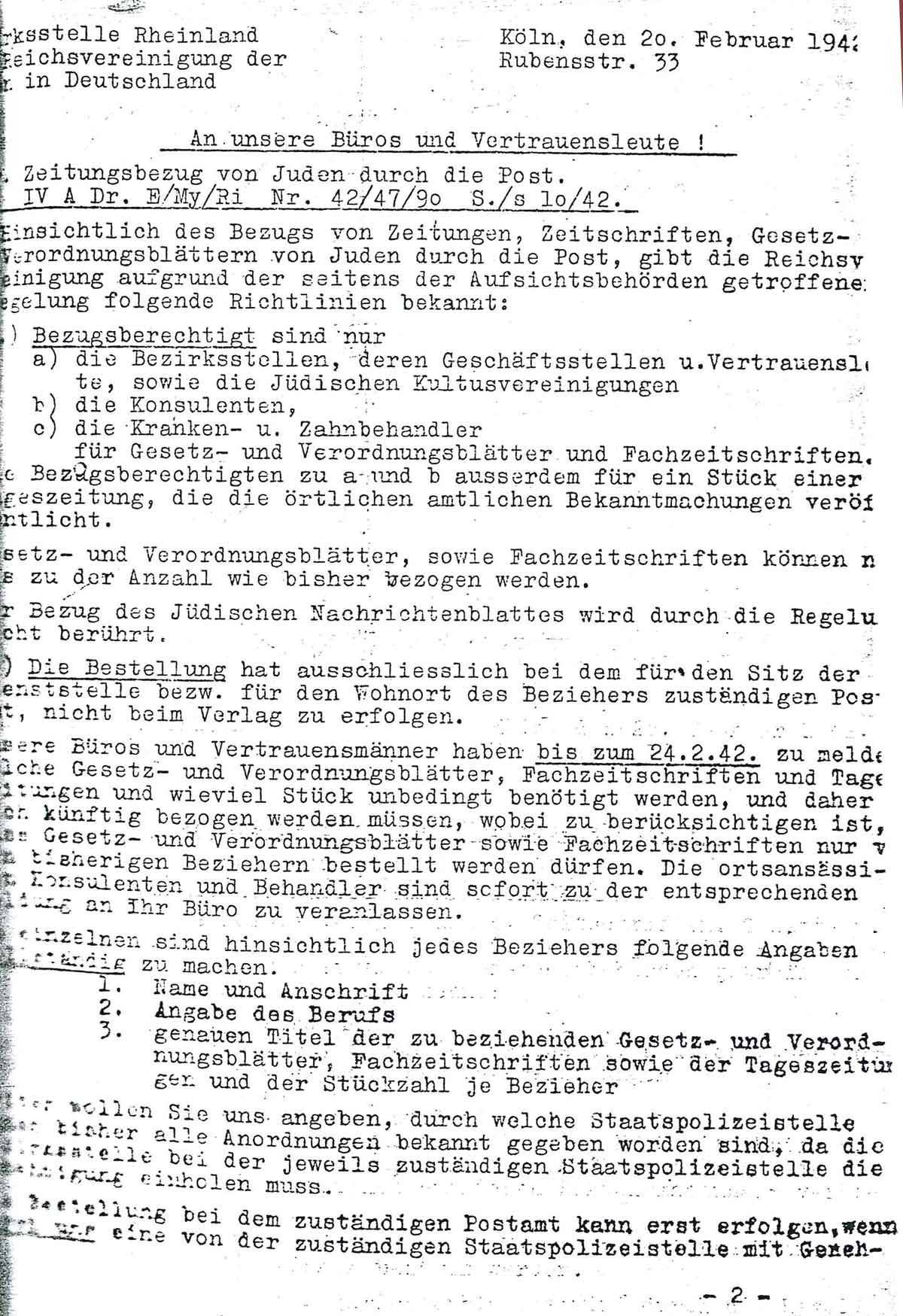 Am 20. Februar 1942 teilt die Bezirksstelle Rheinland der Reichsvereinigung den angeschlossenen Büros Folgendes zum Thema "Zeitungsbezug von Juden durch die Post" Folgendes mit:
