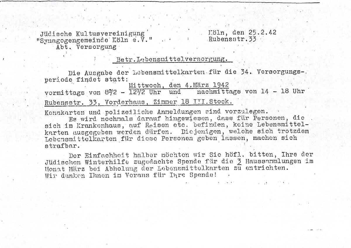 Am 25. Februar 1942 teilt die Synagogengemeinde Köln ihren Mitgliedern Folgendes mit: