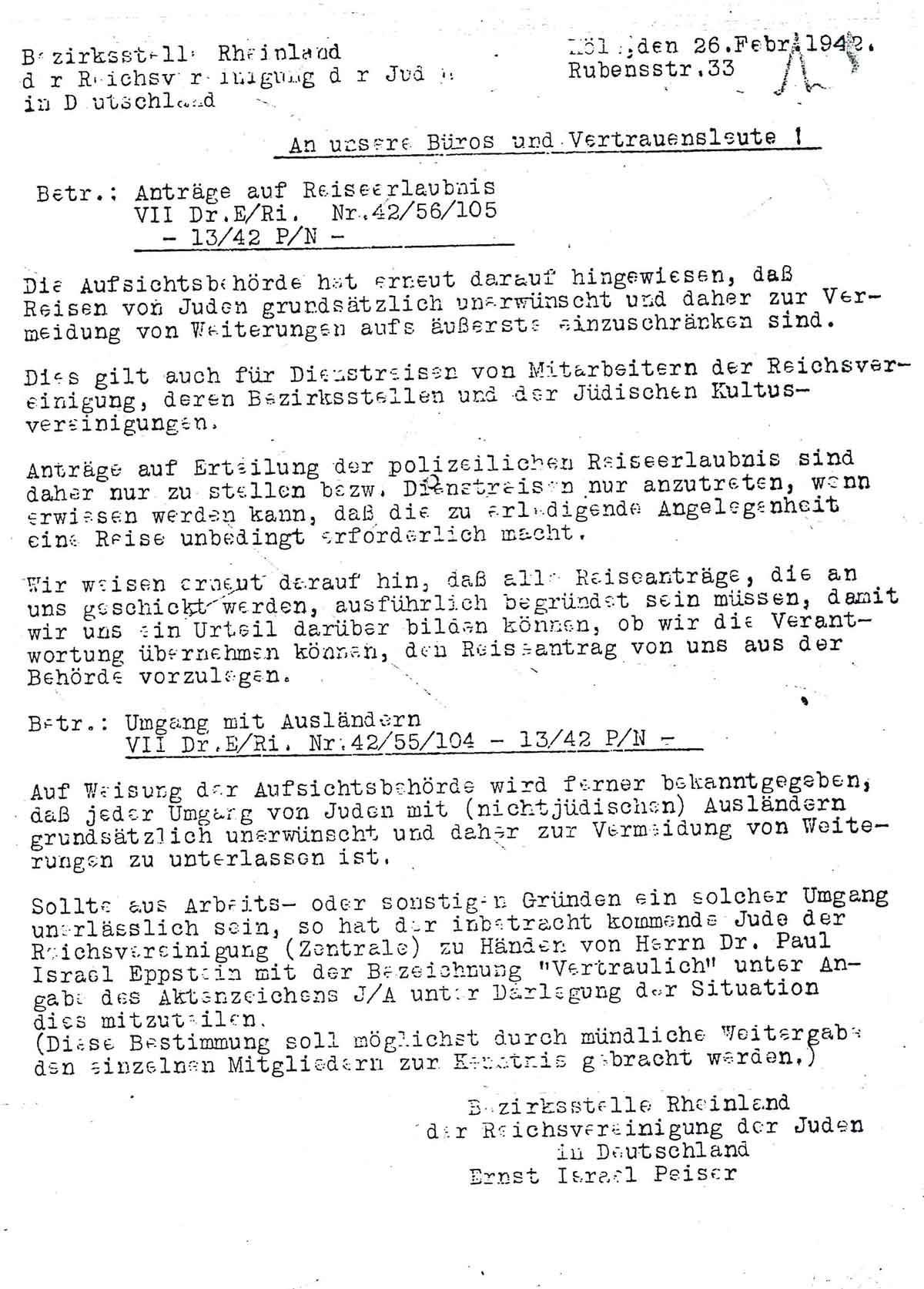 Am 26. Februar 1942 teilt die Bezirksstelle Rheinland der Reichsvereinigung den angeschlossenen Büros Folgendes Folgendes mit: