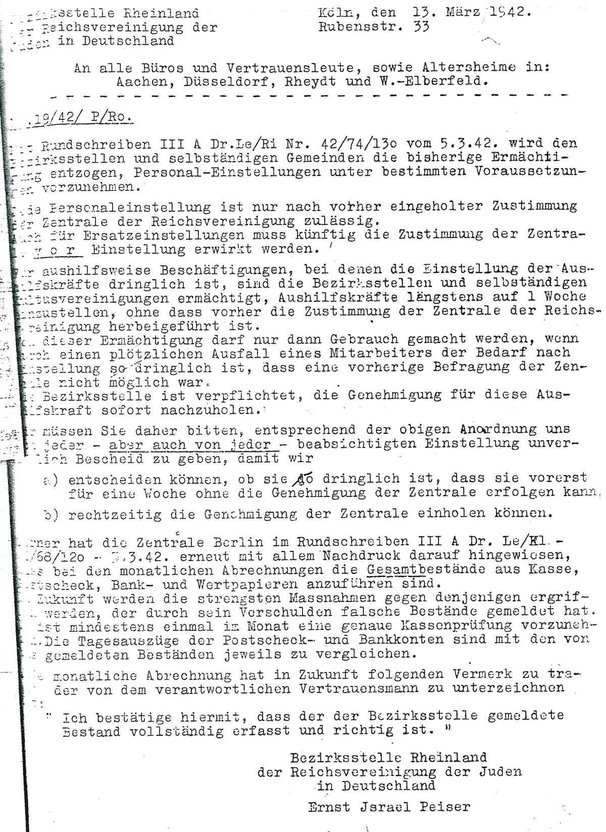 Am 13. März 1942 teilt die Bezirksstelle Rheinland der Reichsvereinigung den angeschlossenen Büros Folgendes mit: