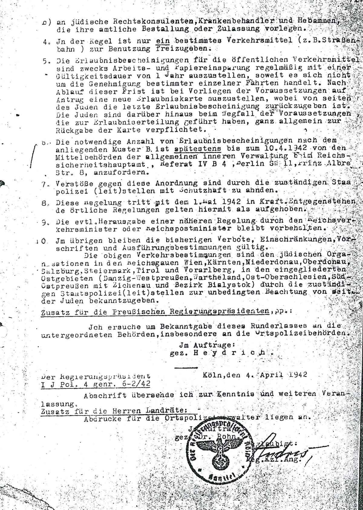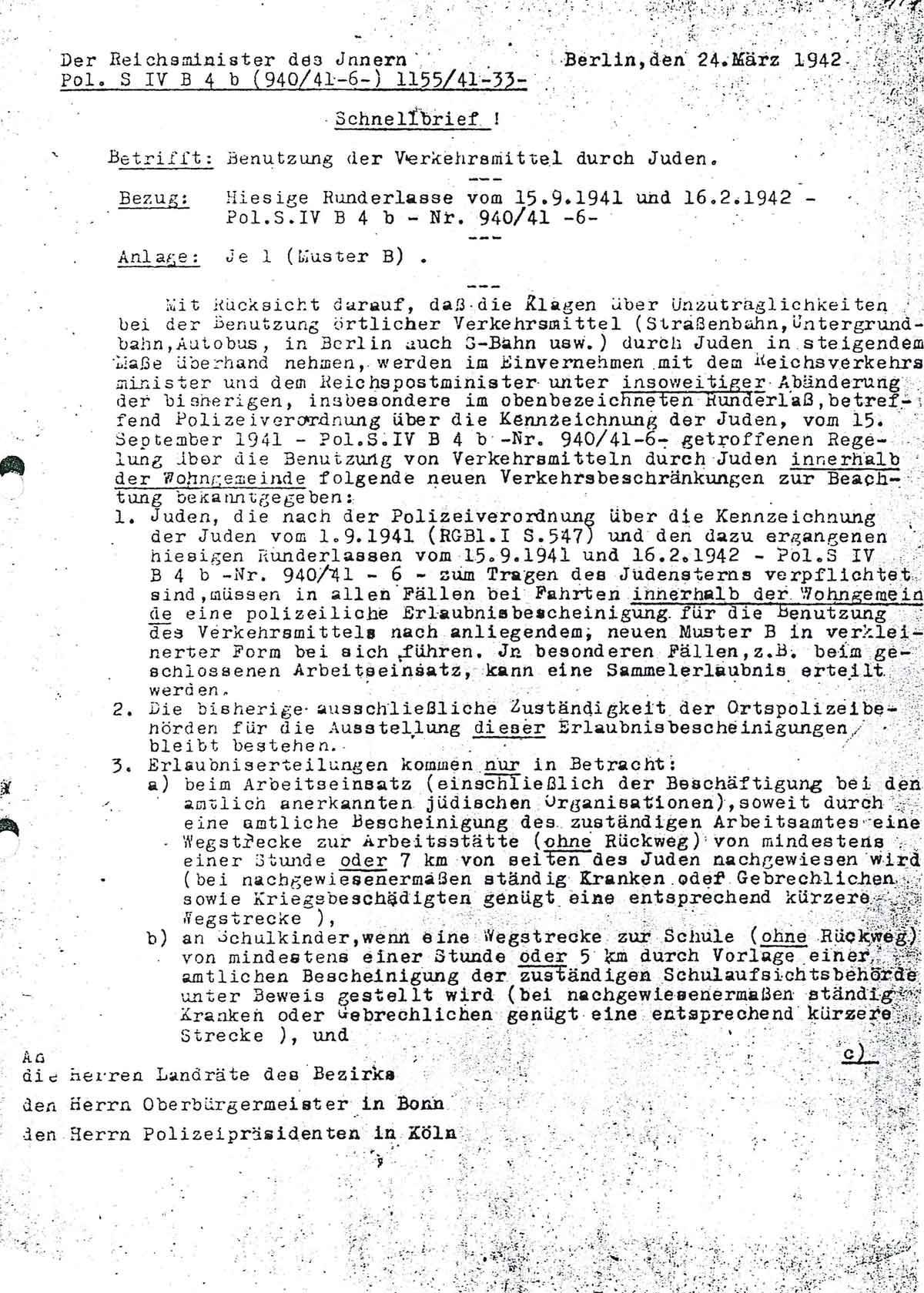 Die obigen Verkehrsbestimmungen sind den jüdischen Organisationen in den Reichsgauen Wien, Kärnten, Niederdonau, Oberdonau, Salzburg, Steiermark, Tirol und Vorarlberg, in den eingegliederten Ostgebieten (Danzig-Westpreußen, Wartheland, Ost-Oberschlesien, Süd-Ostpreußen mit Zichenau und Bezirk Bialystok) durch die zuständigen Staatspolizei(leit)stellen zur unbedingten Beachtung von seiten der Juden gekanntzugeben.