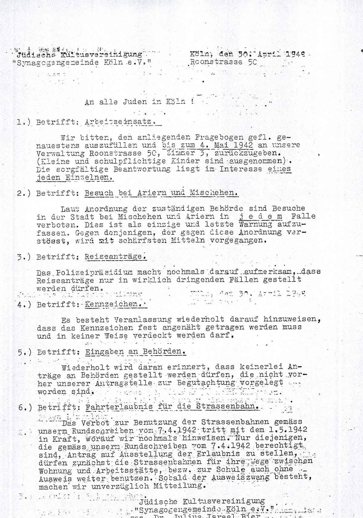 Die Synagogengemeinde Köln teilt ihren Angehörigen am 30. April 1942 per Rundschreiben Folgendes mit: