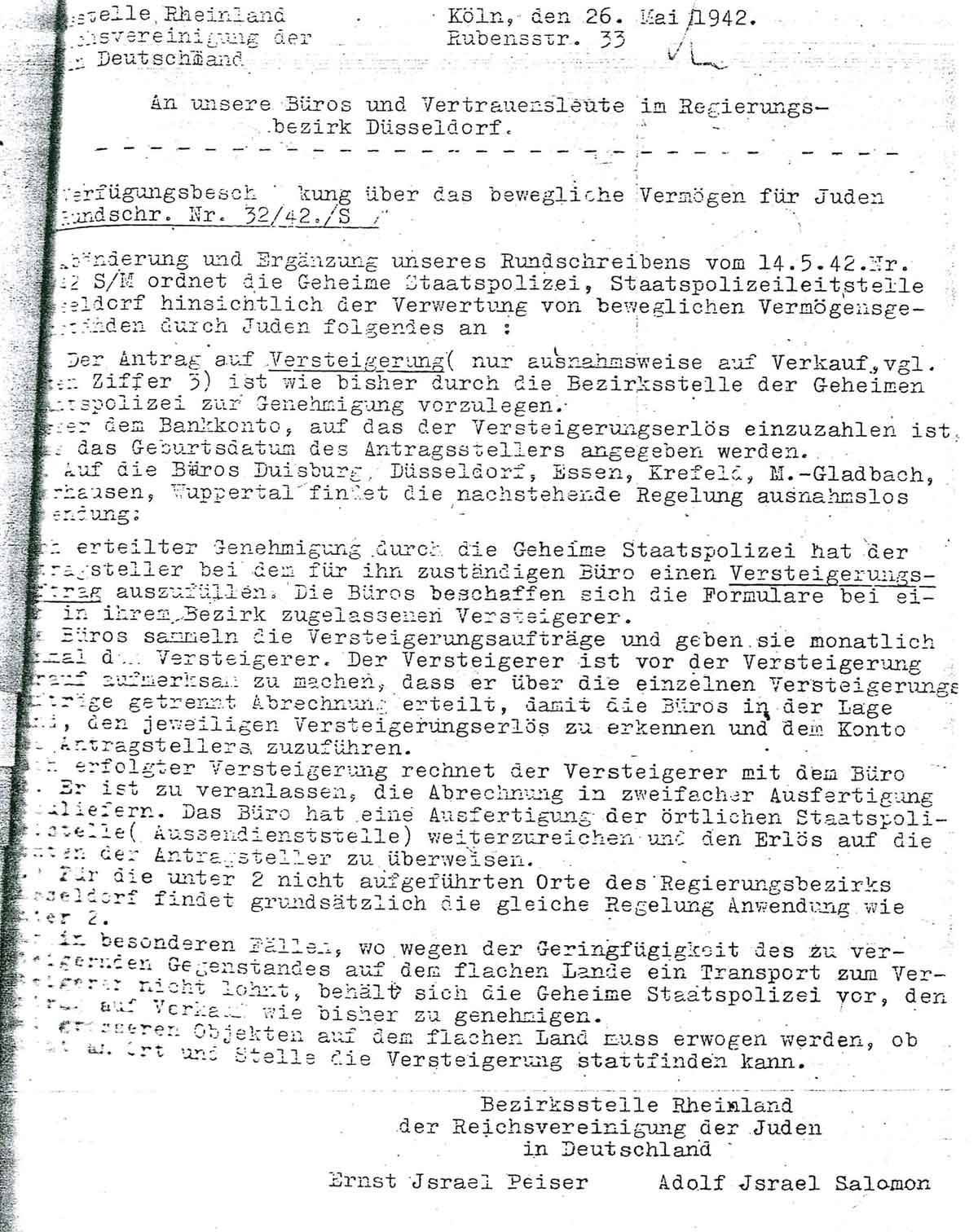 In Abänderung und Ergänzung unseres Rundschreibens vom 14.5.42. Nr. 32/42 S/M ordnet die Geheime Staatspolizei, Staatspolizeileitstelle Düsseldorf hinsichtlich der Verwertung von beweglichen Vermögensge[..] durch Juden folgendes an: