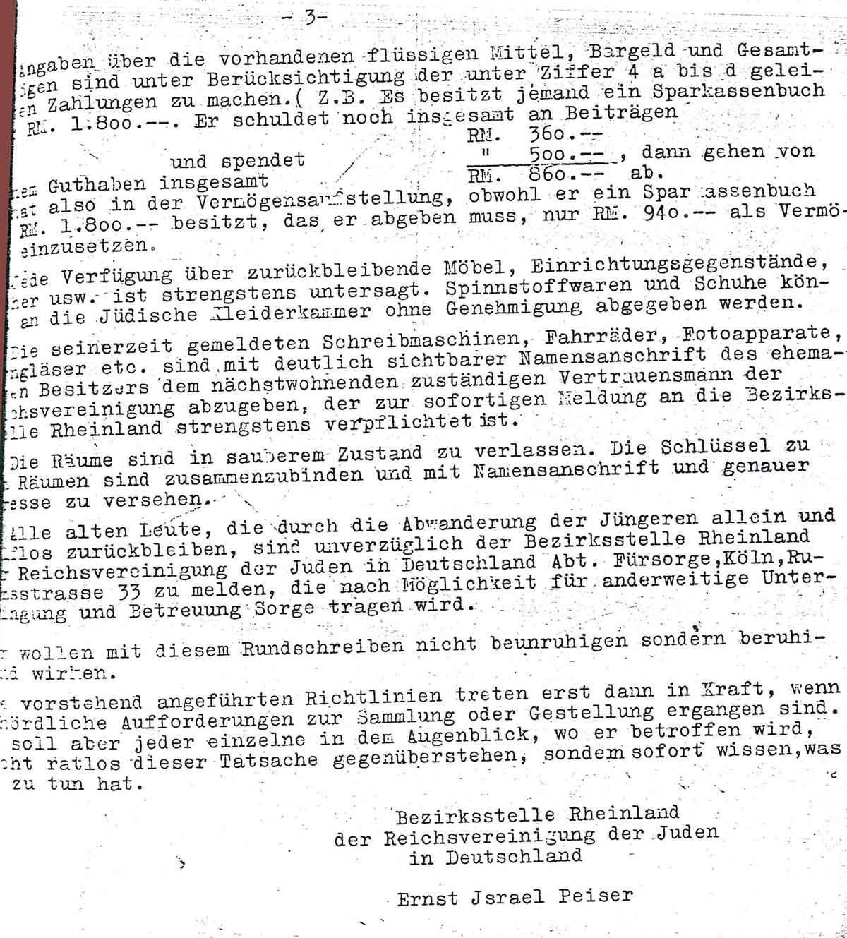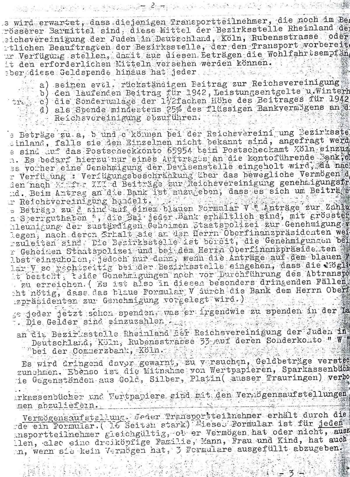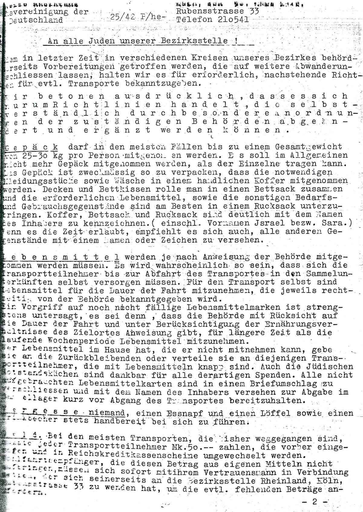 Die Bezirksstelle Rheinland der Reichsvereinigung der Juden teilt der jüdischen Bevölkerung in ihrem Einzugsbereich am 30. Mai 1942 Folgendes mit: