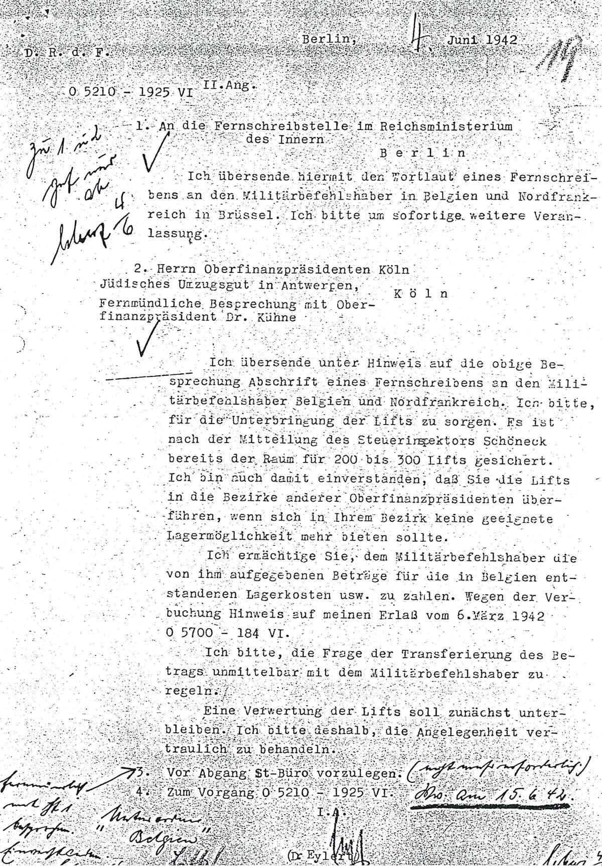 Ich übersende unter Hinweis auf die obige Besprechung Abschrift eines Fernschreibens an den Militärbefehlshaber Belgien und Nordfrankreich. Ich bitte, für die Unterbringung der Lifts zu sorgen. Es ist nach der Mitteilung des Steuerinspektors Schöneck bereits der Raum für 200 bis 300 Lifts gesichert. Ich bin auch damit einverstanden, daß Sie die Lifts in die Bezirke anderer Oberfinanzpräsidenten überführen, wenn sich in Ihrem Bezirk keine geeignete Lagermöglichkeit mehr bieten sollte.