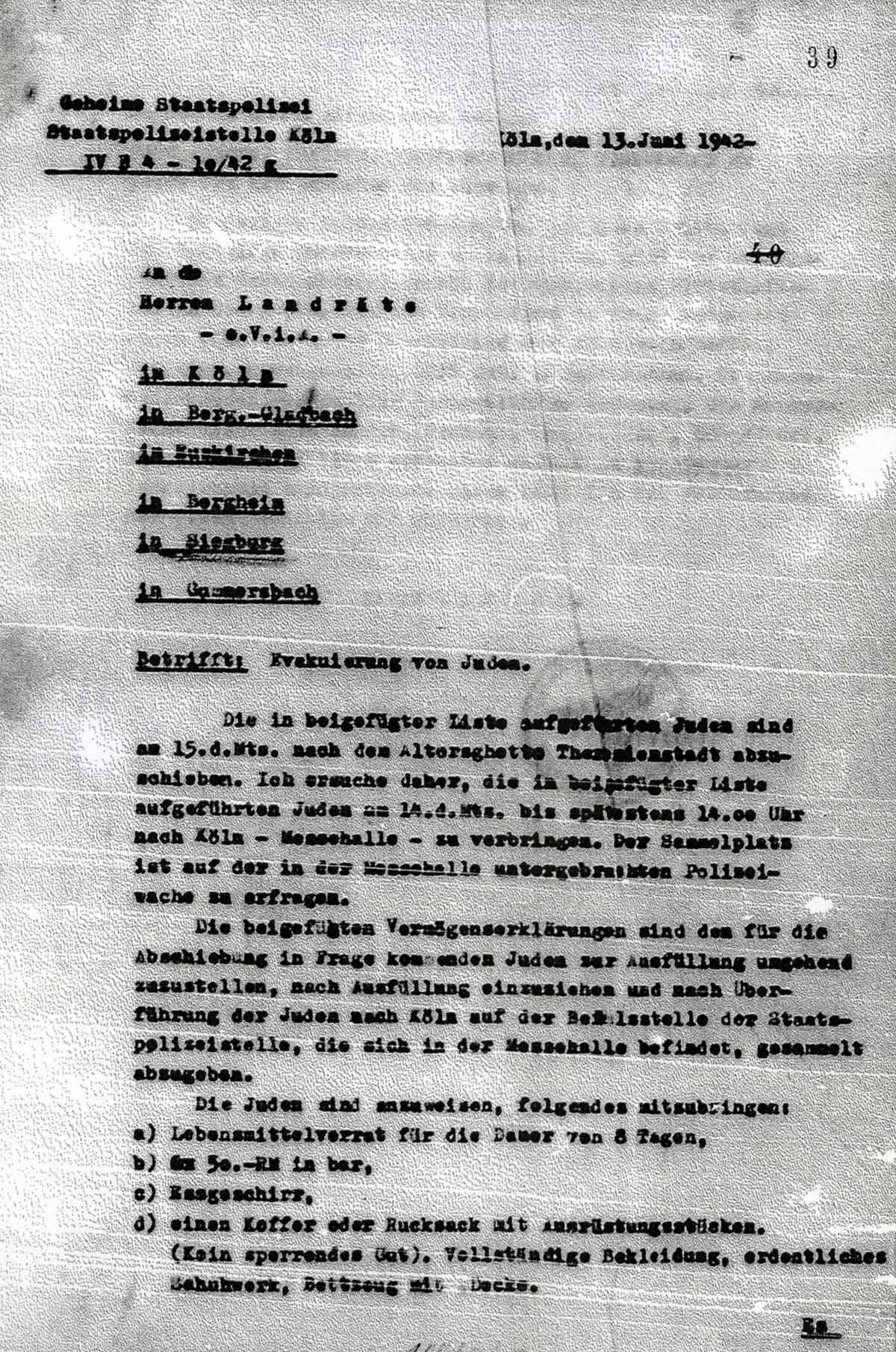 Die in beigefügter Liste aufgeführten Juden sind am 15. d. Mts. nach dem Altersghetto Theresienstadt abzuschieben. Ich ersuche daher, die in beigefügter Liste aufgeführten Juden am 14. d. Mts. bis spätestens 14.00 Uhr nach Köln - Messehalle - zu verbringen. Der Sammelplatz ist auf der in der Messehalle untergebrachten Polizeiwache zu erfragen.