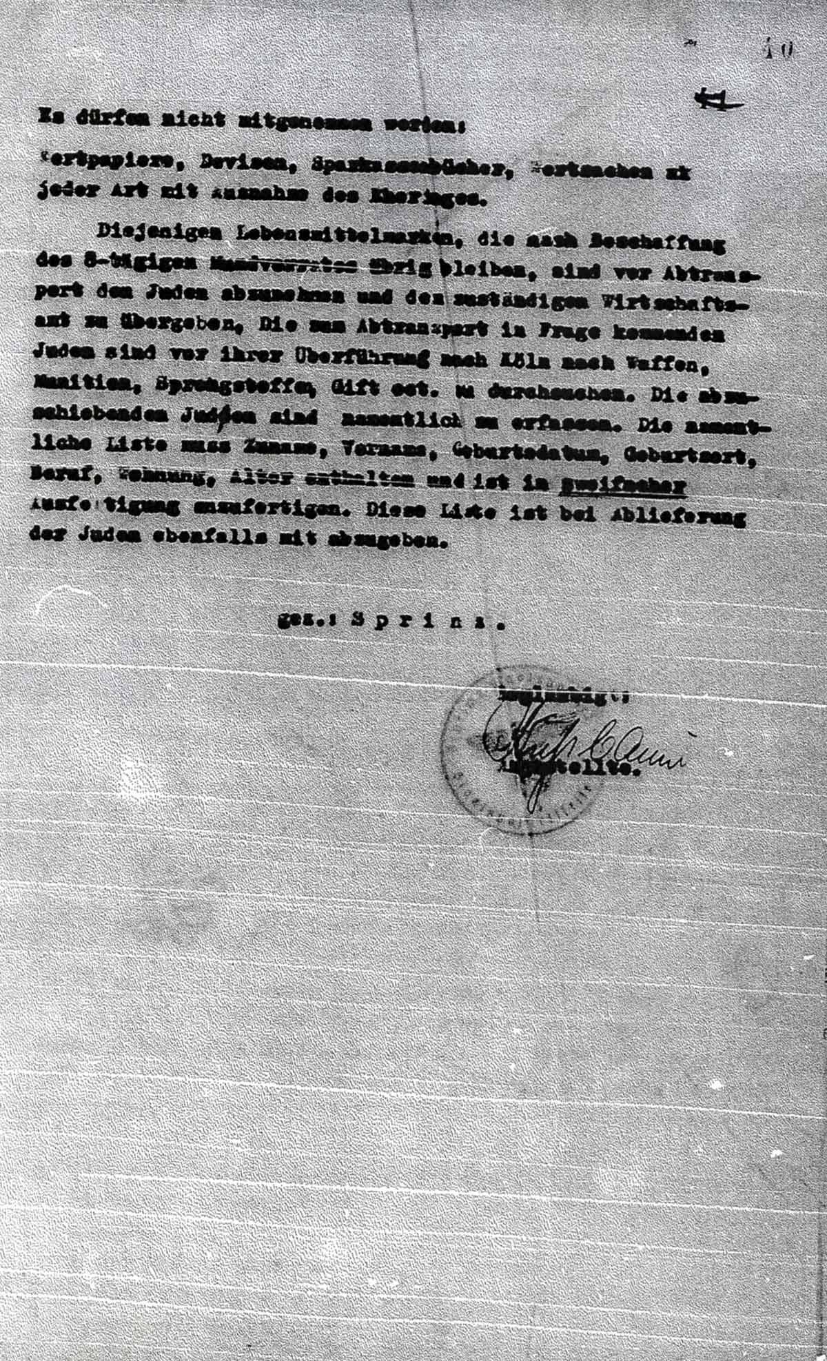 Diejenigen Lebensmittelmarken, die nach Beschaffung des 8-tägigen Mundvorrates übrig bleiben, sind vor Abtransport den Juden abzunehmen und dem zuständigen Wirtschaftsamt zu übergeben. Die zum Abtransport in Frage kommenden Juden sind vor ihrer Überführung nach Köln nach Waffen, Munition, Sprengstoffen, Gift ect. zu durchsuchen. Die abzuschiebenden Juden sind namentlich zu erfassen. Die namentliche Liste muss Zuname, Vorname, Geburtsdatum, Geburtsort, Beruf, Wohnung, Alter enthalten und ist in zweifacher Ausfertigung anzufertigen. Diese Liste ist bei Ablieferung der Juden ebenfalls mit abzugeben.
