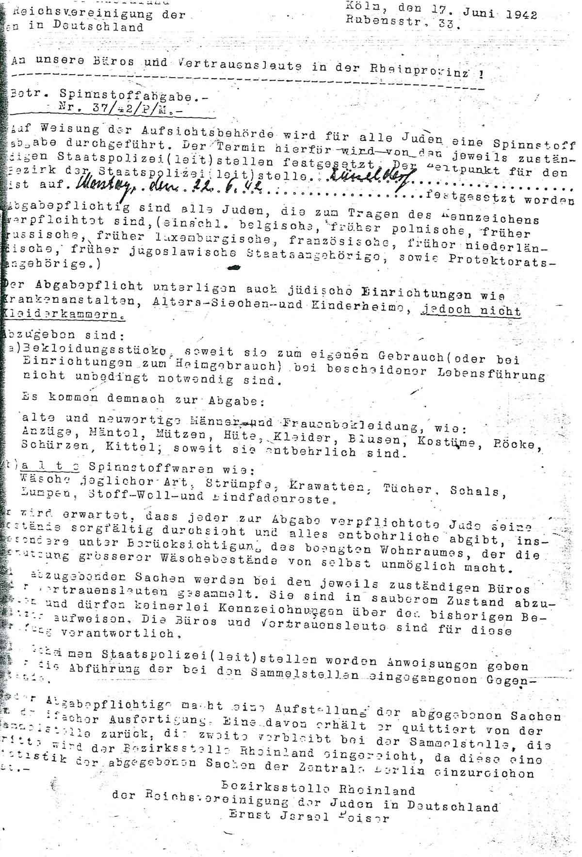 Auf Weisung der Aufsichtsbehörde wird für alle Juden eine Spinnstoffabgabe durchgeführt. Der Termin hierfür wird von den jeweils zuständigen Staatspolizei(leit)stellen festgesetzt. Der Zeitpunkt für den Bezirk der Staatspolizei(leit)stelle Düsseldorf ist auf Montag, den 22.6.42 festgesetzt worden.
